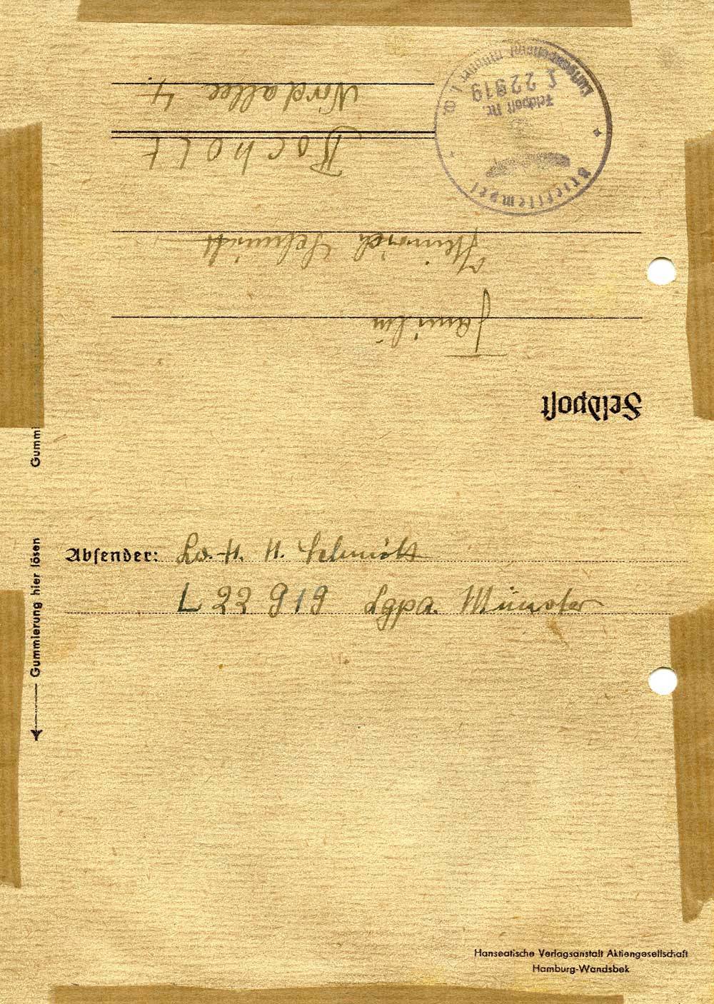 Jetzt ist schon wieder eine halbe Woche vorbei und bis zum Urlaub nur noch drei Tage. Mittlerweile ist der Schulunterricht „chronisch“ geworden. Aber schön ist er nicht. Man ist zu sehr abgelenkt. Aber das Lernen ist ja nicht mehr so wichtig; denn die Abiturprüfung fällt für uns aus. Vater Belting hat mit dem „Reitergeneral“ der SA-Reitergruppe und vereinbart, daß Heinz und ich vielleicht 14 Tage frei bekommen, um in Bocholt unsern Reiterschein zu machen. Ich werde dies natürlich nicht ablehnen und ich glaube Ihr auch nicht? Morgen versuche ich, zum Gebiet zu gehen und dort eventuell zu erreichen, ein drittes Mal in die KLV zu kommen. Da habt Ihr doch sicher nichts dagegen. In der Hoffnung, daß dies klapt, grüßt Euch bis Samstag