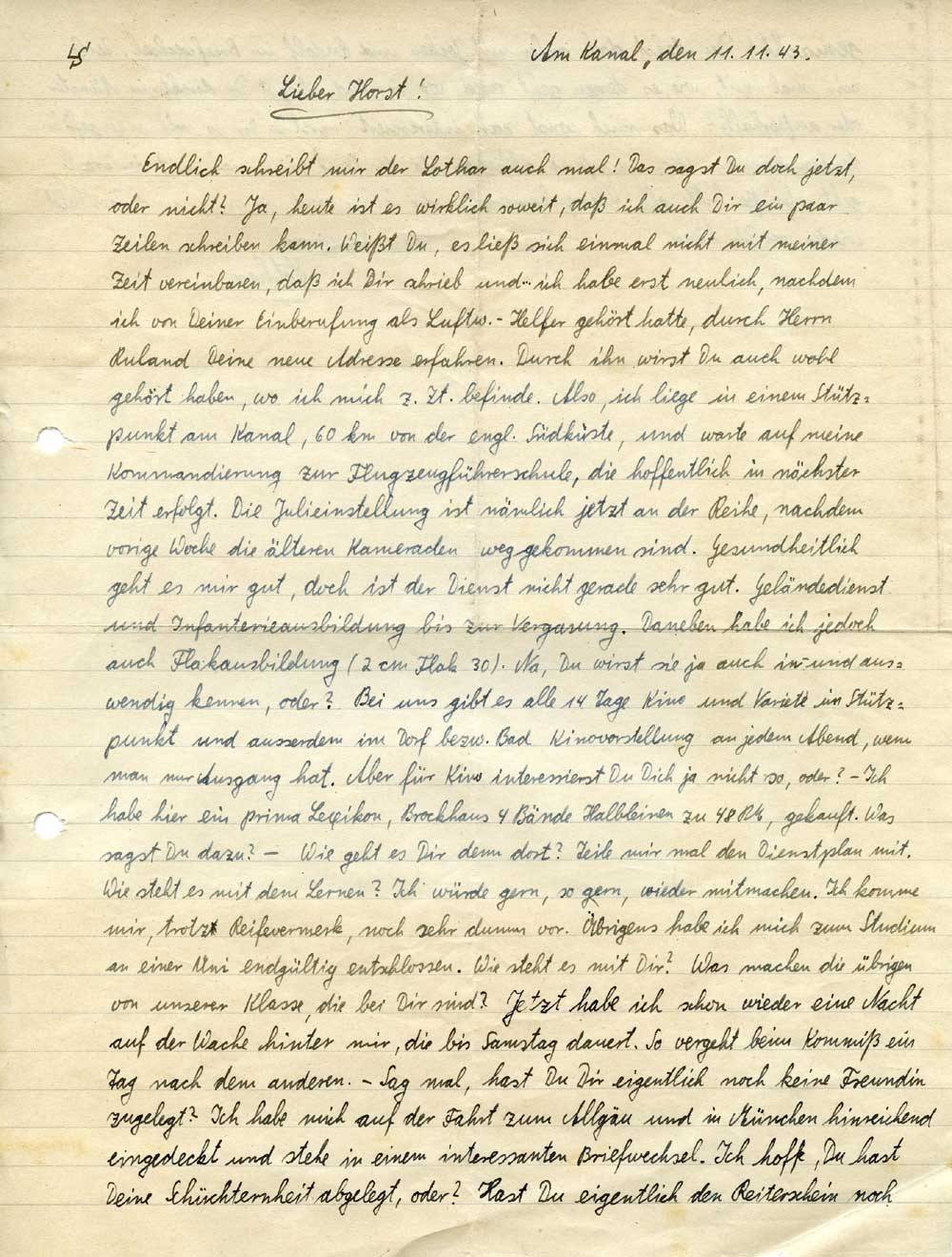 Endlich schreibt mir der Lothar auch mal! Das sagst Du doch jetzt, oder nicht? Ja, heute ist es wirklich soweit, daß ich auch Dir ein paar Zeilen schreiben kann. Weißt Du, es ließ sich einmal nicht mit meiner Zeit vereinbaren, daß ich Dir schrieb und ... ich habe erst neulich, nachdem ich von Deiner Einberufung als Luftw.-Helfer gehört hatte, durch Herrn Ruland Deine neue Adresse erfahren. Durch ihn wirst Du auch wohl gehört haben, wo ich mich z. Zt. befinde. Also, ich liege in einem Stützpunkt am Kanal, 60 km von der engl. Südküste, und warte auf meine Kommandierung zur Flugzeugführerschule, die hoffentlich in nächster Zeit erfolgt. Die Julieinstellung ist nämlich jetzt an der Reihe, nachdem vorige Woche die älteren Kameraden weggekommen sind. Gesundheitlich geht es mir gut, doch ist der Dienst nicht gerade sehr gut. Geländedienst und Infanterieausbildung bis zur Vergasung. Daneben habe ich jedoch auch Flakausbildung (2 cm Flak 30). Na, Du wirst sie ja auch in- und auswendig kennen, oder? Bei uns gibt es alle 14 Tage Kino und Varieté im Stützpunkt und ausserdem im Dorf bezw. Bad Kinovorstellung an jedem Abend, wenn man nur Ausgang hat. Aber für Kino interessierst Du Dich ja nicht so, oder? – Ich habe hier ein prima Lexikon, Brockhaus 4 Bände Halbleinen zu 48 RM, gekauft. Was sagst Du dazu? – Wie geht es Dir denn dort? Teile mir mal den Dienstplan mit. Wie steht es mit dem Lernen? Ich würde gern, so gern, wieder mitmachen. Ich komme mir trotz Reifevermerk, noch sehr dumm vor. Übrigens habe ich mich zum Studium an einer Uni endgültig entschlossen. Wie steht es mit Dir? Was machen die übrigen von unserer Klasse, die bei Dir sind? Jetzt habe ich schon wieder eine Nacht auf der Wache hinter mir, die bis Samstag dauert. So vergeht beim Kommiß ein Tag nach dem anderen. – Sag mal, hast Du Dir eigentlich noch keine Freundin zugelegt? Ich habe mich auf der Fahrt zum Allgäu und in München hinreichend eingedeckt und stehe in einem interessanten Briefwechsel. Ich hoffe, Du hast Deine Schüchternheit abgelegt, oder? Hast Du eigentlich den Reiterschein noch
