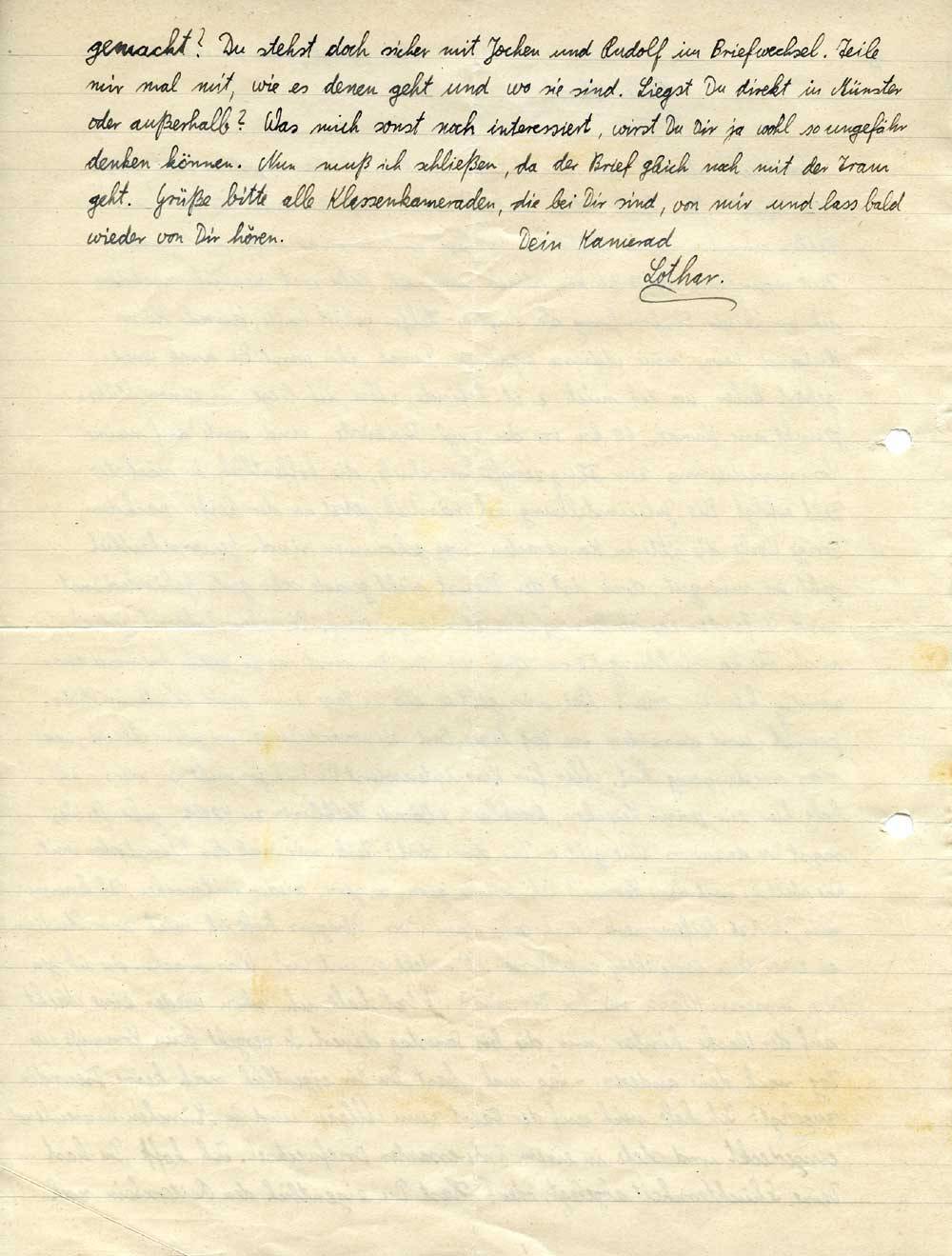 gemacht? Du stehst doch sicher mit Jochen und Rudolf im Briefwechsel. Teile mir mal mit, wie es denen geht und wo sie sind. Liegst Du direkt in Münster oder außerhalb? Was mich sonst noch interessiert, wirst Du Dir ja wohl so ungefähr denken können. Nun muß ich schließen, da der Brief gleich noch mit der Tram geht. Grüße bitte alle Klassenkameraden, die bei Dir sind, von mir und lass bald wieder von Dir hören.