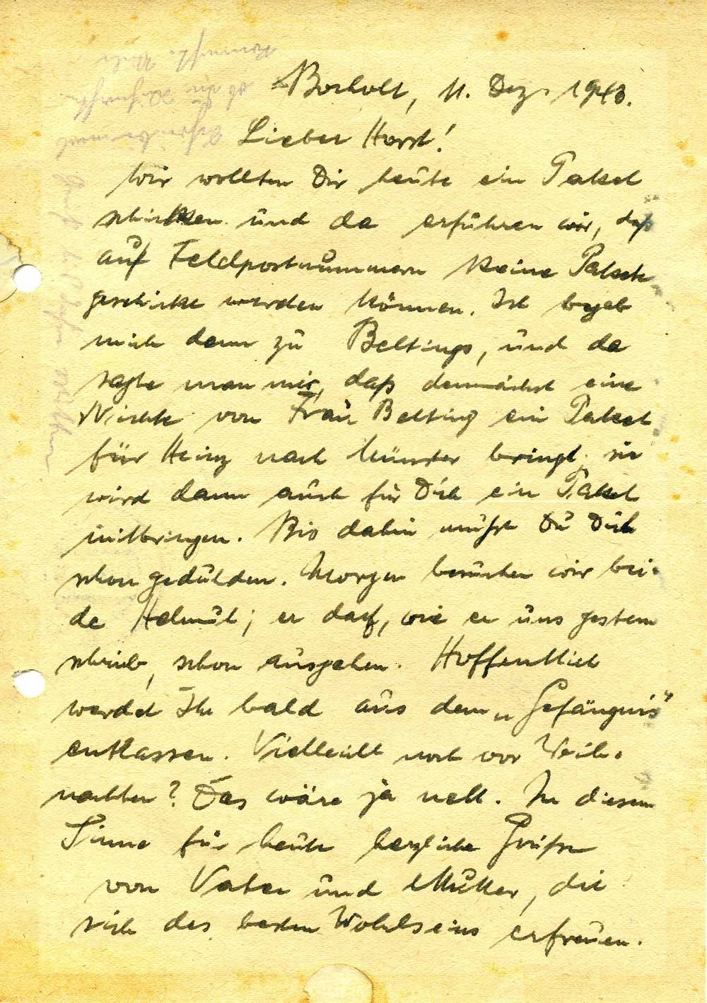 Wir wollten Dir heute ein Paket schicken und da erfahren wir, daß auf Feldpostnummern keine Pakete geschickt werden können. Ich begab mich dann zu Beltings, und da sagte man mir, daß demnächst eine Nichte von Frau Belting ein Paket für Heinz nach Münster bringt; sie wird dann auch für Dich ein Paket mitbringen. Bis dahin mußt Du Dich schon gedulden. Morgen besuchen wir beide Helmut; er darf, wie er uns gestern schrieb, schon ausgehen. Hoffentlich werdet Ihr bald aus dem „Gefängnis“ entlassen. Vielleicht noch vor Weihnachten? Das wäre ja nett. In diesem Sinne für heute herzliche Grüße von Vater und Mutter, die sich des besten Wohlseins erfreuen.