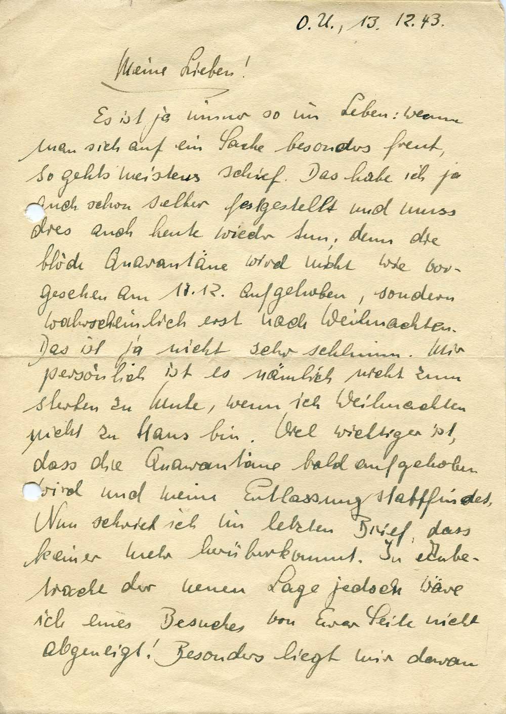Es ist ja immer so im Leben: wenn man sich auf ein Sache besonders freut, so gehts meistens schief. Das habe ich ja auch schon selber festgestellt und muss dies auch heute wieder tun; denn die blöde Quarantäne wird nicht wie vorgesehen am 17.12. aufgehoben, sondern wahrscheinlich erst nach Weihnachten. Das ist ja nicht sehr schlimm. Mir persönlich ist es nämlich nicht zum sterben zu Mute, wenn ich Weihnachten nicht zu Haus bin. Viel wichtiger ist, dass die Quarantäne bald aufgehoben wird und meine Entlassung stattfindet. Nun schrieb ich im letzten Brief, dass keiner mehr herüberkommt. In Anbetracht der neuen Lage jedoch wäre ich eines Besuches von Eurer Seite nicht abgeneigt! Besonders liegt mir daran