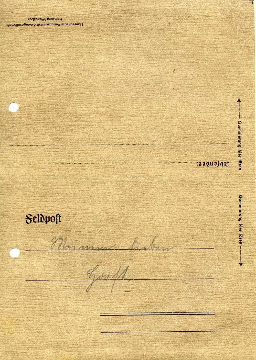 Gerade habe ich Dein Weihnachts-Paket fertig, da kommt die Post mit Deinem Brief. Das Christkind ist in diesem Jahr ganz besonders arm. Aber das ist ja nicht so schlimm. Ich freue mich sehr, daß Du nächste Woche nach Hause kommst. Von Helmut erhielten wir heute Morgen eine Karte vom 18.12. aus Düsseldorf. Er schreibt „Wir rücken aus, wahrscheinlich nach Griechenland. Ob das wohl stimmt? Es tut mir leid, das er zu Weihnachten nichts von uns hat, nicht mal einen Gruß. Er erinnert auch an seinen Geburtstag. Unser Brief kam von Mülheim wieder zurück. Morgen 8 Uhr fahre ich nach Spork, zur Beerdigung der Maria. Sie starb am 18.12. Du brauchst jetzt keine Angst mehr haben wenn ich dahin fahre. Also lieber Horst, ich wünsche Dir recht frohe Weihnachten, und denke auch mal an Helmut an diesen Tagen. Für heute recht herzl. Grüße
