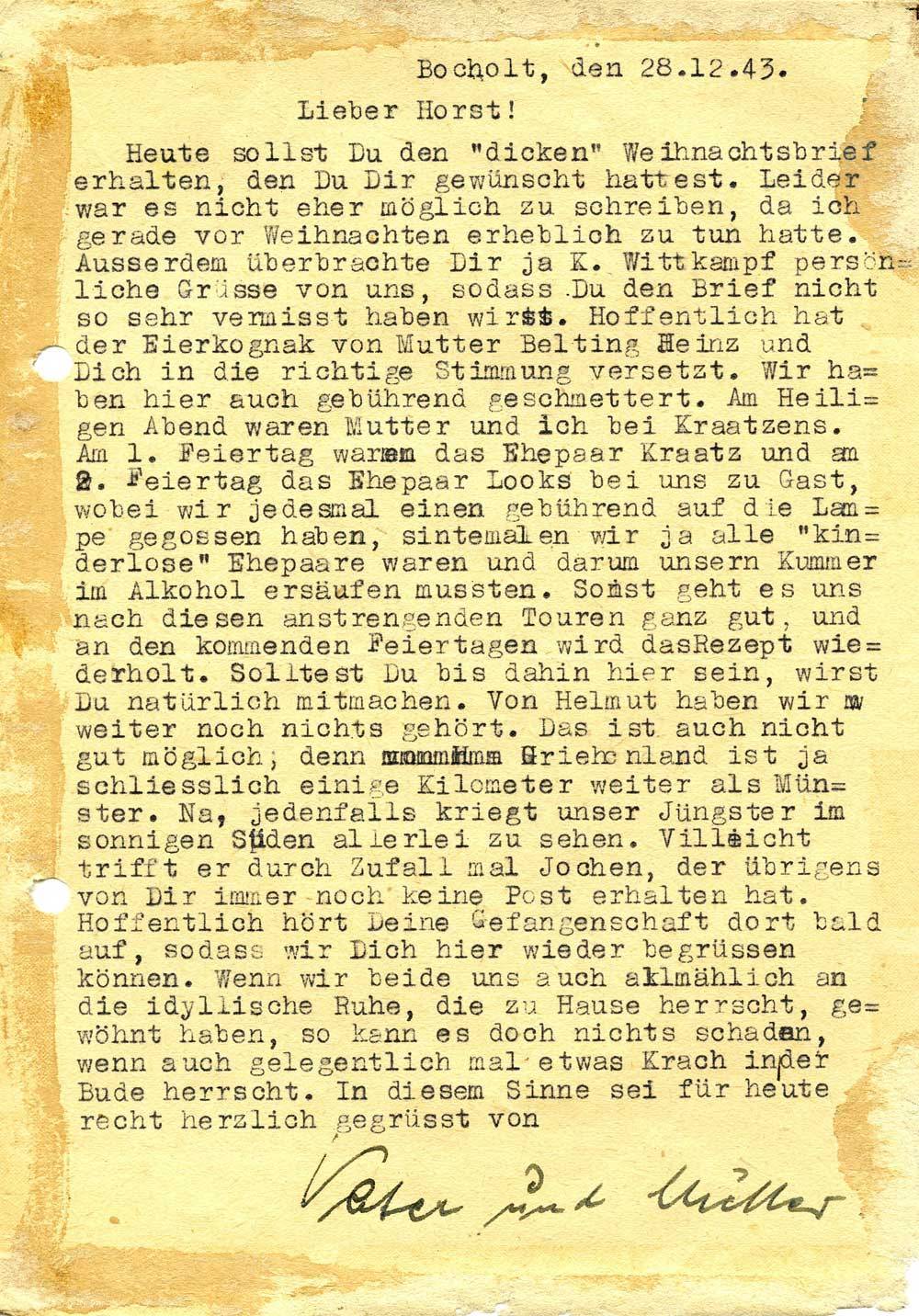 Heute sollst Du den „dicken“ Weihnachtsbrief erhalten, den Du Dir gewünscht hattest. Leider war es nicht eher möglich zu schreiben, da ich gerade vor Weihnachten erheblich zu tun hatte. Ausserdem überbrachte Dir ja K. Wittkampf persönlich Grüsse von uns, sodass Du den Brief nicht so sehr vermisst haben wirst. Hoffentlich hat der Eierkognak von Mutter Belting Heinz und Dich in die richtige Stimmung versetzt. Wir haben hier auch gebührend geschmettert. Am Heiligen Abend waren Mutter und ich bei Kraatzens. Am 1. Feiertag waren das Ehepaar Kraatz und am 2. Feiertag das Ehepaar Looks bei uns zu Gast, wobei wir jedesmal einen gebührend auf die Lampe gegossen haben, sintemalen wir ja alle „kinderlose“ Ehepaare waren und darum unsern Kummer im Alkohol ersäufen mussten. Sonst geht es uns nach diesen anstrengenden Touren ganz gut, und an den kommenden Feiertagen wird das Rezept wiederholt. Solltest Du bis dahin hier sein, wirst Du natürlich mitmachen. Von Helmut haben wir weiter noch nichts gehört. Das ist auch nicht gut möglich; denn Griechenland ist ja schliesslich einige Kilometer weiter als Münster. Na, jedenfalls kriegt unser Jüngster im sonnigen Süden allerlei zu sehen. Vielleicht trifft er durch Zufall mal Jochen, der übrigens von Dir immer noch keine Post erhalten hat. Hoffentlich hört Deine Gefangenschaft dort bald auf, sodass wir Dich hier wieder begrüssen können. Wenn wir beide uns auch allmählich an die idyllische Ruhe, die zu Hause herrscht, gewöhnt haben, so kann es doch nichts schaden, wenn auch gelegentlich mal etwas Krach in der Bude herrscht. In diesem Sinne sei für Heute recht herzlich gegrüsst von