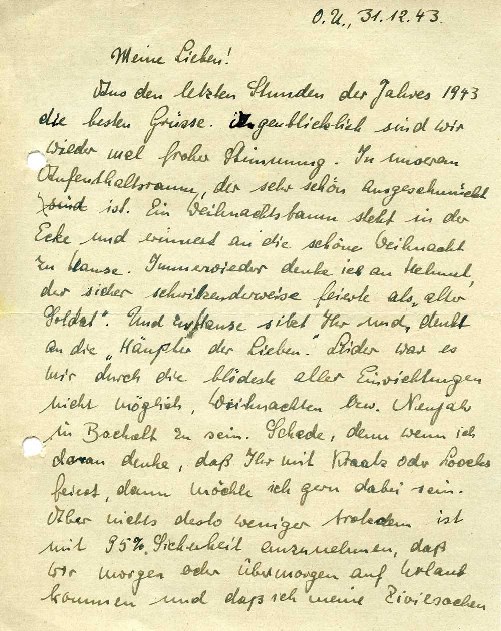 Aus den letzten Stunden des Jahre 1943 die besten Grüsse. Augenblicklich sind wir wieder mal froher Stimmung. In unserem Aufenthaltsraum, der sehr schön ausgeschmückt ist. Ein Weihnachtsbaum steht in der Ecke und erinnert an die schöne Weihnacht zu Hause. Immerwieder denke ich an Helmut, der sicher schwitzenderweise feiert als “alter Soldat“. Und zu Hause sitzt Ihr und denkt an die „Häupter der Lieben“. Leider war es mir durch die blödeste aller Einrichtungen nicht möglich, Weihnachten bzw. Neujahr in Bocholt zu sein. Schade, denn wenn ich daran denke, daß Ihr mit Kraatz oder Looks feiert, dann möchte ich gern dabei sein. Aber nichts desto weniger trotzdem ist mit 95 % Sicherheit anzunehmen, daß wir morgen oder übermorgen auf Urlaub kommen und daß ich meine Zivilsachen