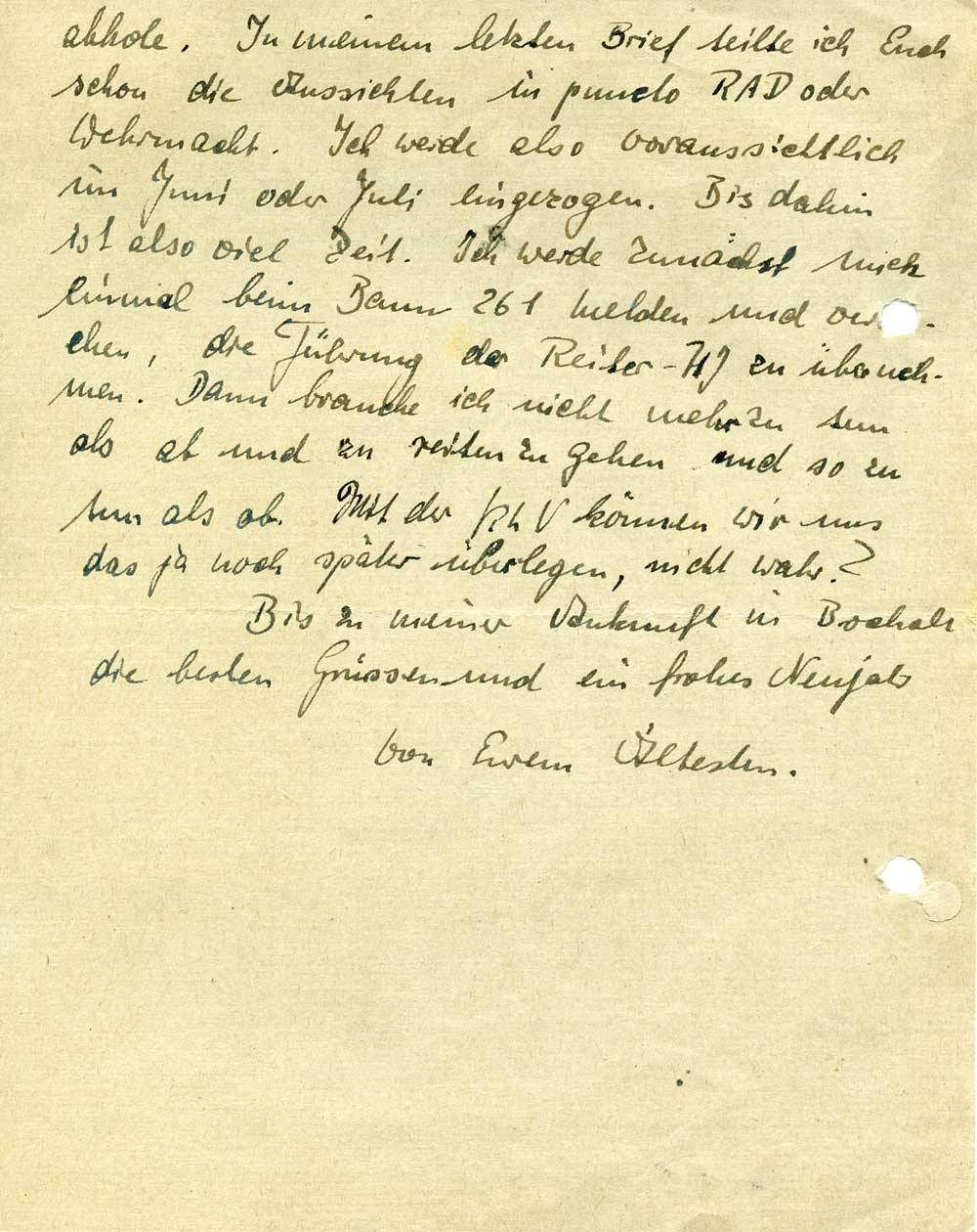 abhole. In meinem letzten Brief teilte ich Euch schon die Aussichten in puncto RAD oder Wehrmacht. Ich werde also voraussichtlich im Juni oder Juli eingezogen. Bis dahin ist also viel Zeit. Ich werde zunächst mich einmal beim Bann 261 melden und versuchen, die Führung der Reiter-HJ zu übernehmen. Dann brauche ich nicht mehr zu tun als ab und zu reiten zu gehen und so zu tun als ob. Mit der KLV können wir uns das ja noch später überlegen, nicht wahr?