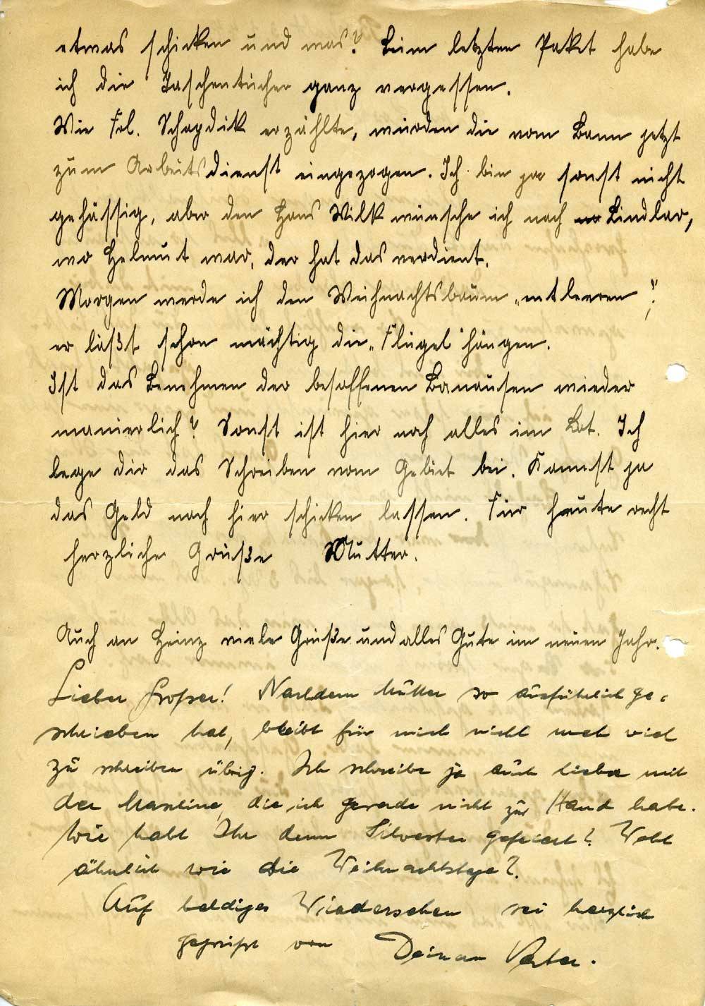 Lieber Großer! Nachdem Mutter so ausführlich geschrieben hat, bleibt für mich nicht mehr viel zu schreiben übrig. Ich schreibe ja auch lieber mit der Maschine, die ich gerade nicht zur Hand habe. Wie habt Ihr denn Silvester gefeiert? Wohl ähnlich wie die Weihnachtstage?