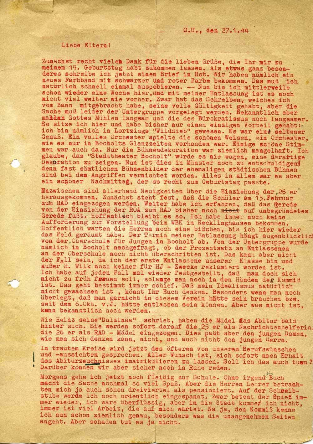 Inzwischen sind allerhand Neuigkeiten über die Einziehung der „26 er“ herausgekommen. Zunächst steht fest, daß die Schüler am 15. Februar zum RAD eingezogen werden. Weiter habe ich erfahren, daß das Gerede von der Einziehung der ROA zum RAD bisher noch auf unbegründetes Gerede fußt. Hoffentlich bleibt es so. Ich habe immer noch keine Aufforderung zur Vorstellung beim WBK in Recklinghausen bekommen. Hoffentlich warten die Herren noch eine bißchen, bis ich hier wieder das Feld geräumt habe. Der Termin meiner Entlassung hängt augenblicklich von der „Oberschule für Jungen in Bocholt“ ab. Von der Untergruppe wurde nämlich in Bocholt nachgefragt, ob der Prozentsatz an Entlassenen an der Oberschule noch nicht überschritten ist. Das kann aber nicht der Fall sein, da ich der erste Entlassene unserer Klasse bin und außer H. Wilk noch keiner für HJ-Zwecke reklamiert worden ist. Ich habe auf jeden Fall mal wieder festgestellt, daß man doch sich nicht zu früh freuen soll, solange man noch in den Händen des Kommiß ist. Das geht bestimmt immer schief. Daß mein Idealismus natürlich nicht gewachsen ist, könnt Ihr Euch denken. Besonders wenn man noch überlegt, daß man garnicht in diesem Verein hätte sein brauchen bzw. seit dem 6. Okt. v. J. hätte entlassen sein können. Aber was nicht ist, kann bekanntlich noch werden.