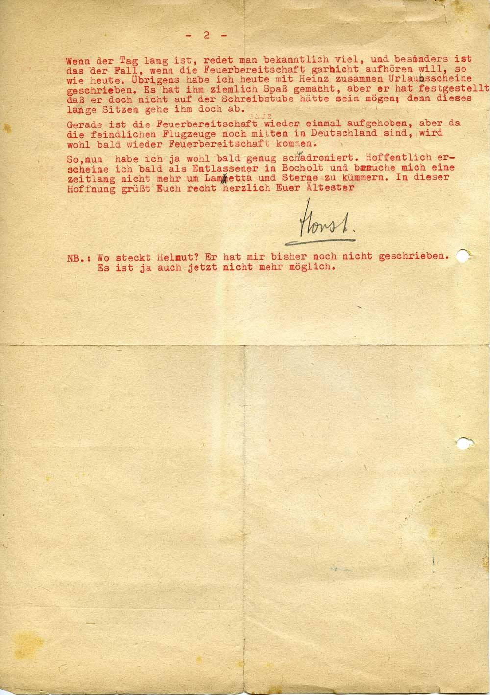 So, nun habe ich ja wohl bald genug schwadroniert. Hoffentlich erscheine ich bald als Entlassener in Bocholt und brauche mich eine zeitlang nicht mehr um Lametta und Sterne zu kümmern. In dieser Hoffnung grüßt Euch recht herzlich Euer Ältester