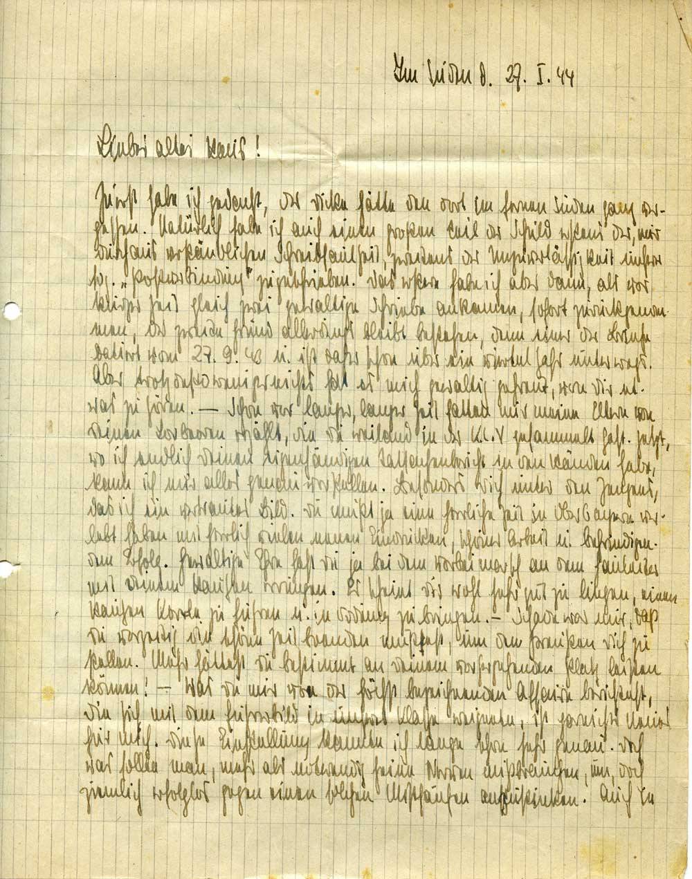 Zuerst habe ich gedacht, der Dicke hätte den dort im fernen Süden ganz vergessen. Natürlich habe ich auch einen großen Teil der Schuld erstens die, mir durchaus verständlichen Schreibfaulheit, zweitens die Unzuverlässigkeit unserer sog. „Postverbindung“ zuzuschreiben. Das erstere habe ich aber dann, als vor kurzer Zeit gleich zwei gewaltige Schriebe ankamen, sofort zurückgenommen, der zweite Grund allerdings bleibt bestehen, denn einer der Briefe datiert vom 27.9.43 u. ist daher schon über ein viertel Jahr unterwegs. Aber trotzdestowenigernichts hat es mich gewaltig gefreut, von Dir etwas zu hören. – Schon vor langer, langer Zeit hatten mir meine Eltern von Deinen Lorbeeren erzählt, die Du weiland in der K.L.V. gesammelt hast. Jetzt, wo ich endlich Deinen eigenhändigen Tatsachenbericht in den Händen habe, kann ich mir alles genau vorstellen. Besonders Dich unter den Jungens, das ist ein vertrautes Bild. Du mußt ja eine herrliche Zeit in Oberbayern verlebt haben mit herrlich vielen neuen Eindrücken, schöner Arbeit u. befriedigendem Erfolg. Gewaltige Ehre hast Du ja bei dem Vorbeimarsch an dem Gauleiter mit Deinem Haufen errungen. Es scheint Dir wohl sehr gut zu liegen, einen Haufen Kerle zu führen u. in Ordnung zu bringen. – Schade war nur, daß Du vorzeitig die schöne Zeit beenden mußtest, um den Preußen Dich zu stellen. Mehr hättest Du bestimmt an Deinem vorhergehenden Platz leisten können! – Was Du mir von der höchst bezeichnenden Affäre berichtest, die sich mit dem Führerbild in unserer Klasse ereignete, ist garnichts Neues für mich. Diese Einstellung kannte ich lange schon sehr genau. Doch was sollte man, mehr als notwendig seine Nerven mißbrauchen, um, doch ziemlich erfolglos gegen einen solchen Misthaufen aufzustinken. Auch in