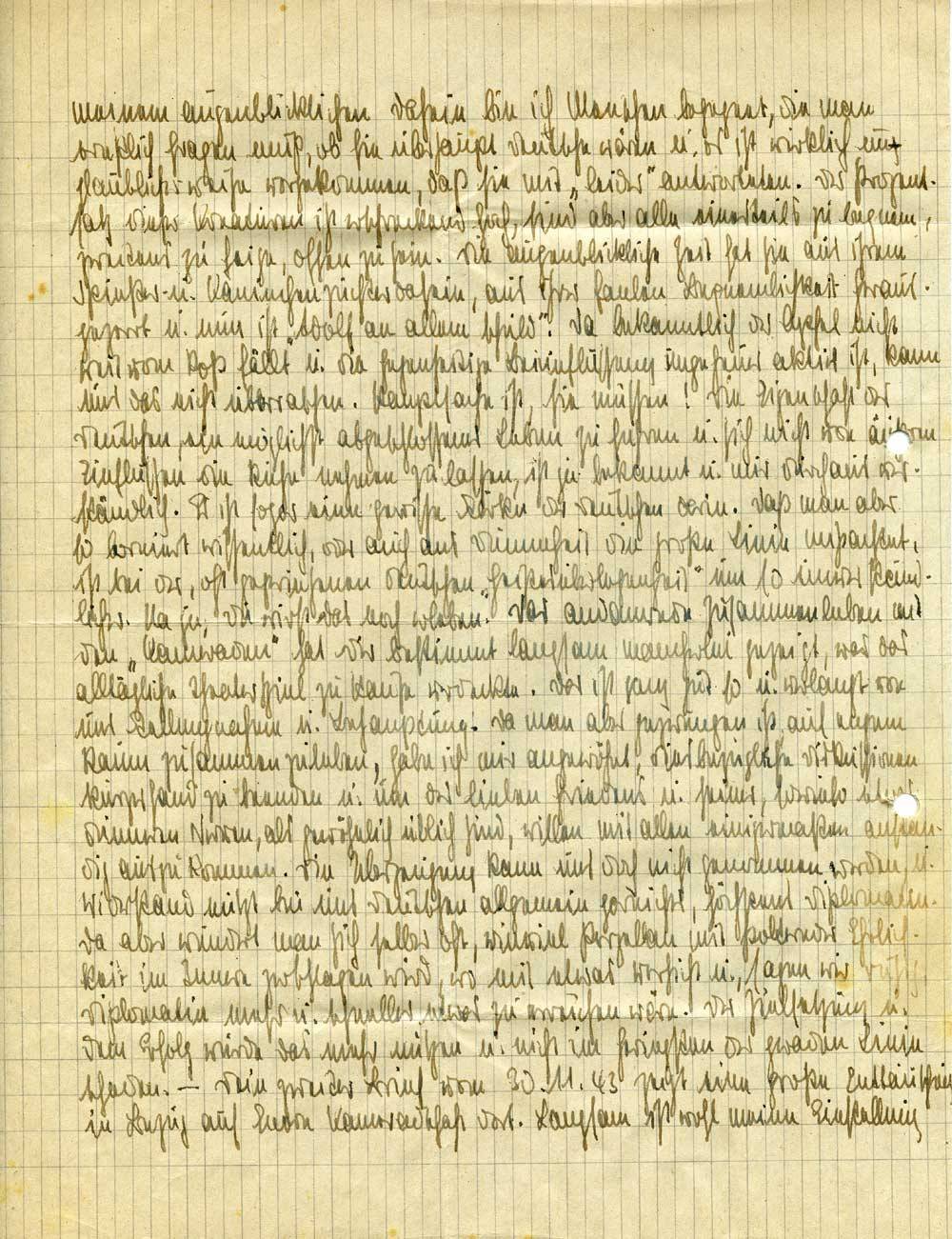 meinem augenblicklichen Dasein bin ich Menschen begegnet, die man ernstlich fragen muß, ob sie überhaupt Deutsche wären u. es ist wirklich unglaublicherweise vorgekommen, daß sie mit „leider“ antworteten. Der Prozentsatz dieser Kreaturen ist erschreckend hoch, sind aber alle einesteils zu bequem, zweitens zu feige, offen zu sein. Die augenblickliche Zeit hat sie aus ihrem Spießer- u. Kaninchenzüchterdasein, aus ihrer faulen Bequemlichkeit herausgezerrt u. nun ist „Adolf an allem schuld“. Da bekanntlich der Apfel nicht weit vom Roß fällt u. die gegenseitige Beeinflussung ungeheuer aktiv ist, kann uns das nicht überraschen. Hauptsache ist, sie müssen! Die Eigenschaft des Deutschen, ein möglichst abgeschlossenes Leben zu führen u. sich nicht von äußeren Einflüssen die Ruhe nehmen zu lassen, ist ja bekannt u. mir durchaus verständlich. Es ist sogar eine gewisse Stärke der Deutschen darin. Daß man aber so borniert wissentlich, oder auch aus Dummheit die große Linie mißachtet, ist bei der, oft gepriesenen deutschen „Geistesüberlegenheit“ um so [?] peinlicher. Na ja, Du wirst das noch erleben. Das andauernde Zusammenleben mit den „Kameraden“ hat Dir bestimmt langsam mancherlei gezeigt, was das alltägliche Theaterspiel zu Hause verdeckte. Das ist ganz gut so u. verlangt von uns Stellungnahme u. Behauptung. Da man aber gezwungen ist auf engem Raum zusammenzuleben, habe ich mir angewöhnt, diesbezügliche Diskussionen kurzerhand zu beenden u. um des lieben Friedens u. seiner, sowieso etwas dünneren Nerven, als gewöhnlich üblich sind, willen mit allen einigermaßen anständig auszukommen. Die Überzeugung kann uns doch nicht genommen werden, u. Widerstand nutzt bei uns Deutschen allgemein garnichts, höchstens Diplomatie. Da aber wundert man sich selber oft, wieviel Porzellan mit polternder Ehrlichkeit im Innern zerschlagen wird, wo mit etwas Vorsicht u., sagen wir ruhig, Diplomatie mehr u. schneller etwas zu erreichen wäre. Der Zielsetzung u. dem Erfolg würde das mehr nutzen u. nicht im Geringsten der geraden Linie schaden. – Dein zweiter Brief vom 30.11.43 zeigt eine große Enttäuschung in Bezug auf Eure Kameradschaft dort. Langsam ist wohl meine Einstellung