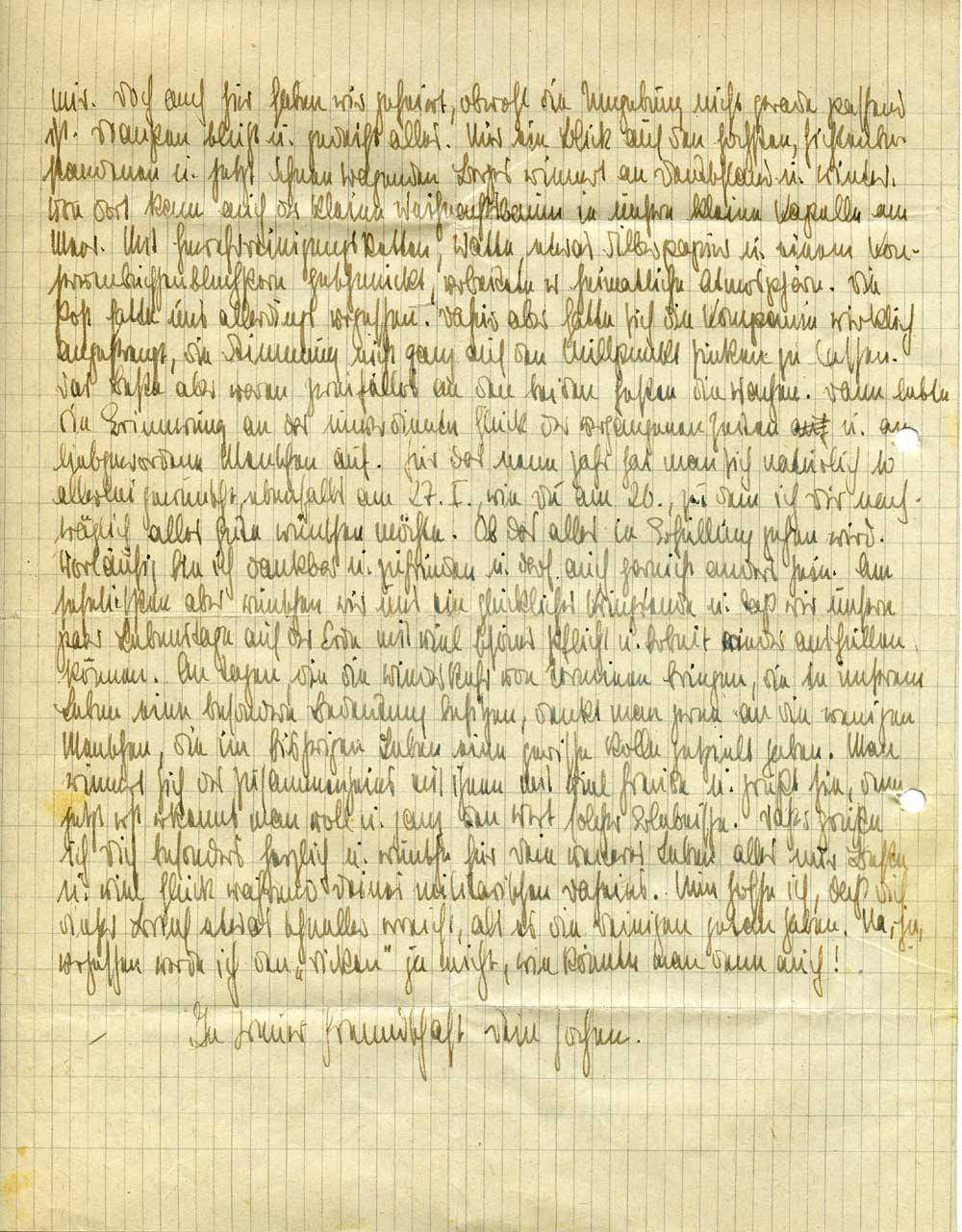 mir. Doch auch hier haben wir gefeiert, obwohl die Umgebung nicht gerade passend ist. Draußen blüht u. gedeiht alles. Nur ein Blick auf den höchsten, fichtenbestandenen u. jetzt Schnee tragenden Berges erinnert an Deutschland u. Winter. Von dort kam auch der kleine Weihnachtsbaum in unsere kleine Kapelle am Meer. Mit Gewehrreinigungsketten, Watte, etwas Silberpapier u. einem Konservenbüchsenblechstern geschmückt, verbreitete er heimatliche Atmosphäre. Die Post hatte uns allerdings vergessen. Dafür aber hatte sich die Kompanie wirklich angestrengt, die Stimmung nicht ganz auf den Nullpunkt sinken zu lassen. Das Beste aber waren zweifellos an den beiden Festen die Wachen. Dann lebte die Erinnerung an das unverdiente Glück der vergangenen Zeiten u. an liebgewordene Menschen auf. Für das neue Jahr hat man sich natürlich so allerlei gewünscht, ebenfalls am 27.I., wie Du am 26., zu dem ich Dir nachträglich alles Gute wünschen möchte. Ob das alles in Erfüllung gehen wird. Vorläufig bin ich dankbar u. zufrieden u. darf auch garnicht anders sein. Am sehnlichsten aber wünschen wir uns ein glückliches Kriegsende u. daß wir unsere paar Lebenstage auf der Erde mit viel schöner Pflicht u. Arbeit wieder ausfüllen können. An Tagen, die die Wiederkehr von Terminen bringen, die in unserem Leben eine besondere Bedeutung besitzen, denkt man gerne an die wenigen Menschen, die im bisherigen Leben eine gewisse Rolle gespielt haben. Man erinnert sich des Zusammenseins mit ihnen mit viel Freude u. grüßt sie, denn jetzt erst erkennt man voll u. ganz den Wert solcher Erlebnisse. Daher grüße ich Dich besonders herzlich u. wünsche für Dein weiteres Leben alles nur Beste u. viel Glück während Deines militärischen Daseins. Nun hoffe ich, daß Dich dieser Brief etwas schneller erreicht, als es die deinigen getan haben. Na, ja, vergessen werde ich den „Dicken“ ja nicht, wie könnte man denn auch!