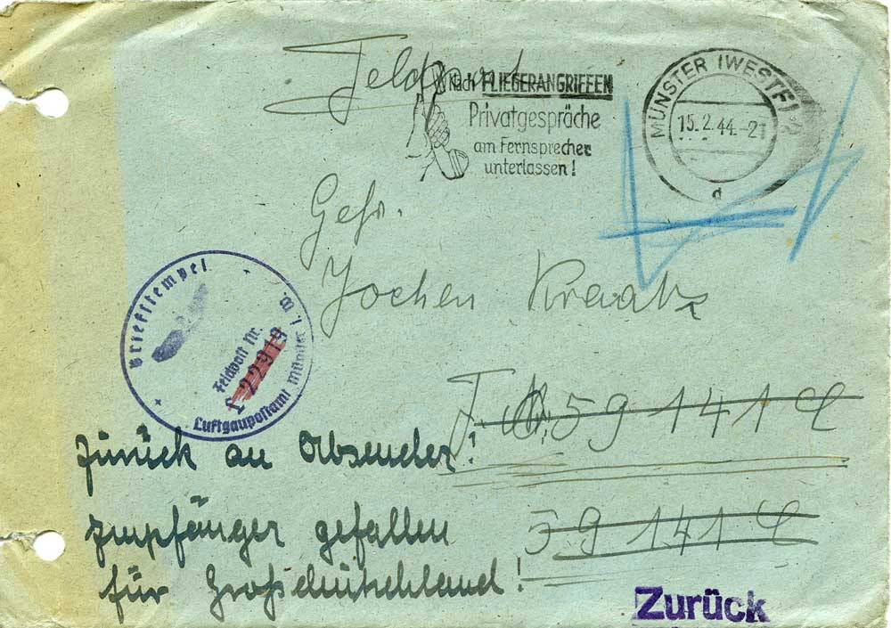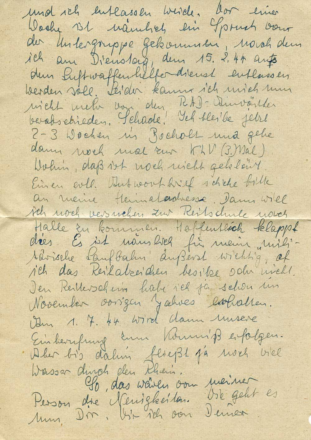 und ich entlassen werde. Vor einer Woche ist nämlich ein Spruch von der Untergruppe gekommen, nach dem ich am Dienstag, dem 15.2.44 aus dem Luftwaffenhelferdienst entlassen werden soll. Leider kann ich mich nun nicht mehr von den RAD-Anwärtern verabschieden. Schade! Ich bleibe jetzt 2-3 Wochen in Bocholt und gehe dann noch mal zur KLV (3. Mal). Wohin, daß ist noch nicht geklärt. Einen evtl. Antwortbrief schicke bitte an meine Heimatadresse. Dann will ich noch versuchen zur Reitschule nach Halle zu kommen. Hoffentlich klappt dies. Es ist nämlich für meine „militärische Laufbahn“ äußerst wichtig, ob ich das Reitabzeichen besitze oder nicht. Den Reiterschein habe ich ja schon im November vorigen Jahres erhalten. Am 1.7.44 wird dann unsere Einberufung zum Kommiß erfolgen. Aber bis dahin fließt ja noch viel Wasser durch den Rhein.