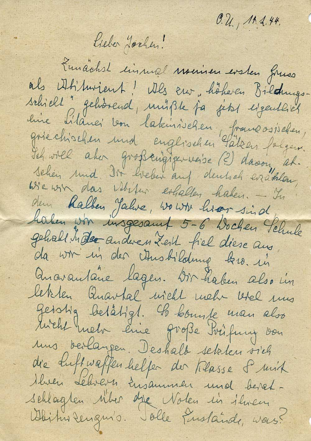 Zunächst einmal meinen ersten Gruss als Abiturient! Als zur „höheren Bildungsschicht“ gehörend, müßte ja jetzt eigentlich eine Litanei von lateinischen, französischen, griechischen und englischen Sätzen folgen. Ich will aber großzügigerweise (?) davon absehen und Dir lieber auf deutsch erzählen, wie wir das Abitur erhalten haben. – In dem halben Jahre, wo wir hier sind, haben wir insgesamt 5-6 Wochen Schule gehabt. In der anderen Zeit fiel diese aus, da wir in der Ausbildung bzw. in Quarantäne lagen. Wir haben also im letzten Quartal nicht mehr viel uns geistig betätigt. So konnte man also nicht mehr eine große Prüfung von uns verlangen. Deshalb setzten sich die Luftwaffenhelfer der Klasse 8 mit ihren Lehrern zusammen und beratschlagten über die Noten in ihrem Abiturzeugnis. Tolle Zustände, was?