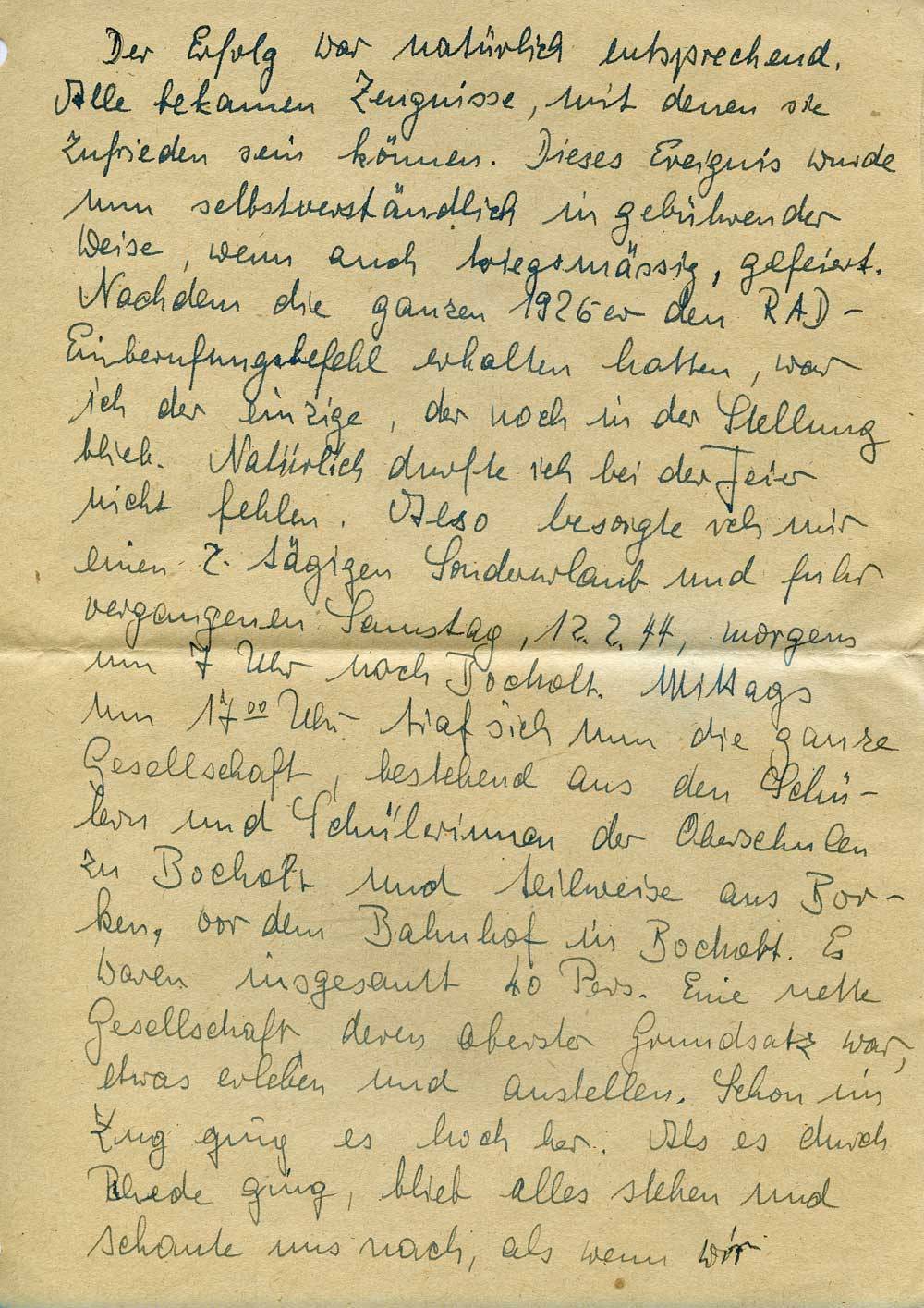 Der Erfolg war natürlich entsprechend. Alle bekamen Zeugnisse, mit denen sie zufrieden sein können. Dieses Ereignis wurde nun selbstverständlich in gebührender Weise, wenn auch kriegsmässig, gefeiert. Nachdem die ganzen 1926-er den RAD-Einberufungsbefehl erhalten hatten, war ich der einzige, der noch in der Stellung blieb. Natürlich durfte ich bei der Feier nicht fehlen. Also besorgte ich mir einen 2-tägigen Sonderurlaub und fuhr vergangenen Samstag, 12.2.44, morgens um 7 Uhr nach Bocholt. Mittags um 17.00 Uhr traf sich nun die ganze Gesellschaft, bestehend aus den Schülern und Schülerinnen der Oberschulen zu Bocholt und teilweise aus Borken, vor dem Bahnhof in Bocholt. Es waren insgesamt 40 Pers. Eine nette Gesellschaft, deren oberster Grundsatz war, etwas erleben und anstellen. Schon im Zug ging es hoch her. Als es durch Rhede ging, blieb alles stehen und schaute uns nach, als wenn wir