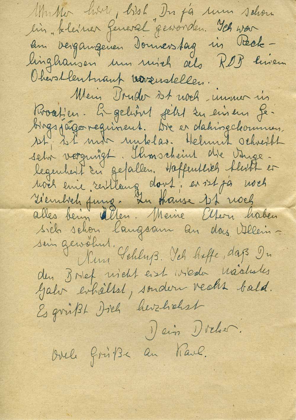 Mein Bruder ist noch immer in Kroatien. Er gehört jetzt zu einem Gebirgsjägerregiment. Wie er dahingekommen ist, ist mir unklar. Helmut schreibt sehr vergnügt. Ihm scheint die Angelegenheit zu gefallen. Hoffentlich bleibt er noch eine Zeitlang dort; er ist ja noch ziemlich jung. Zu Hause ist noch alles beim Alten. Meine Eltern haben sich schon langsam an das Alleinsein gewöhnt.