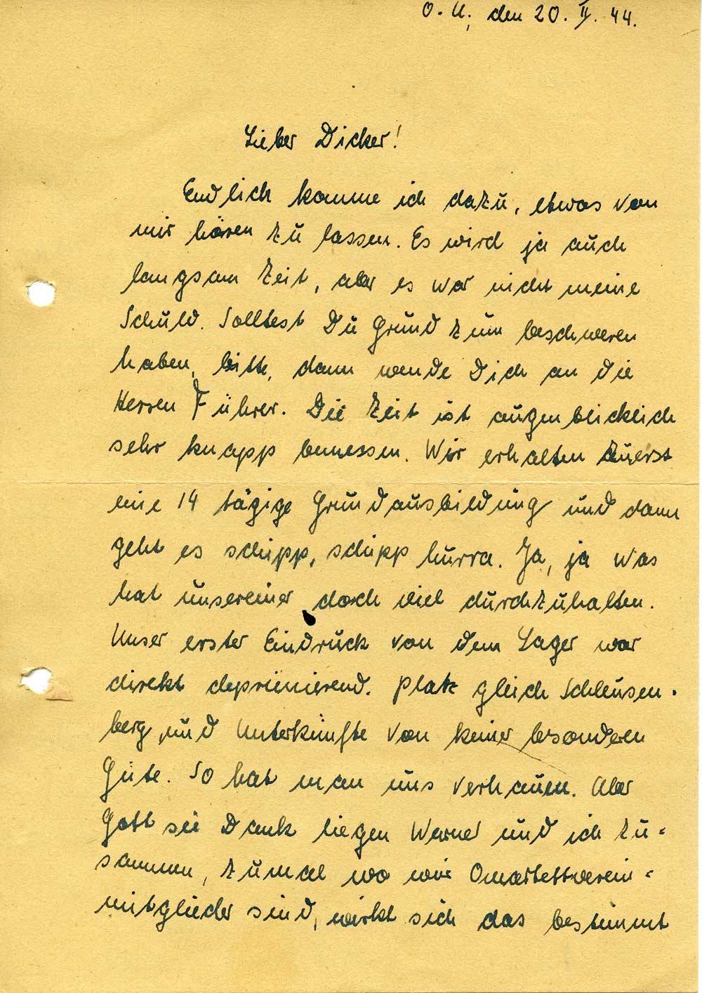 Endlich komme ich dazu, etwas von mir hören zu lassen. Es wird ja auch langsam Zeit, aber es war nicht meine Schuld. Solltest Du Grund zum beschweren haben, bitte, dann wende Dich an die Herren Führer. Die Zeit ist augenblicklich sehr knapp bemessen. Wir erhalten zuerst eine 14 tägige Grundausbildung und dann geht es schipp, schipp hurra. Ja, ja was hat unsereiner doch viel durchzuhalten. Unser erster Eindruck von dem Lager war direkt deprimierend. Platz gleich Schleusenberg und Unterkünfte von keiner besonderen Güte. So hat man uns verhauen. Aber Gott sei Dank liegen Werner und ich zusammen, zumal wo wir Quartettvereinsmitglieder sind, wirkt sich das bestimmt