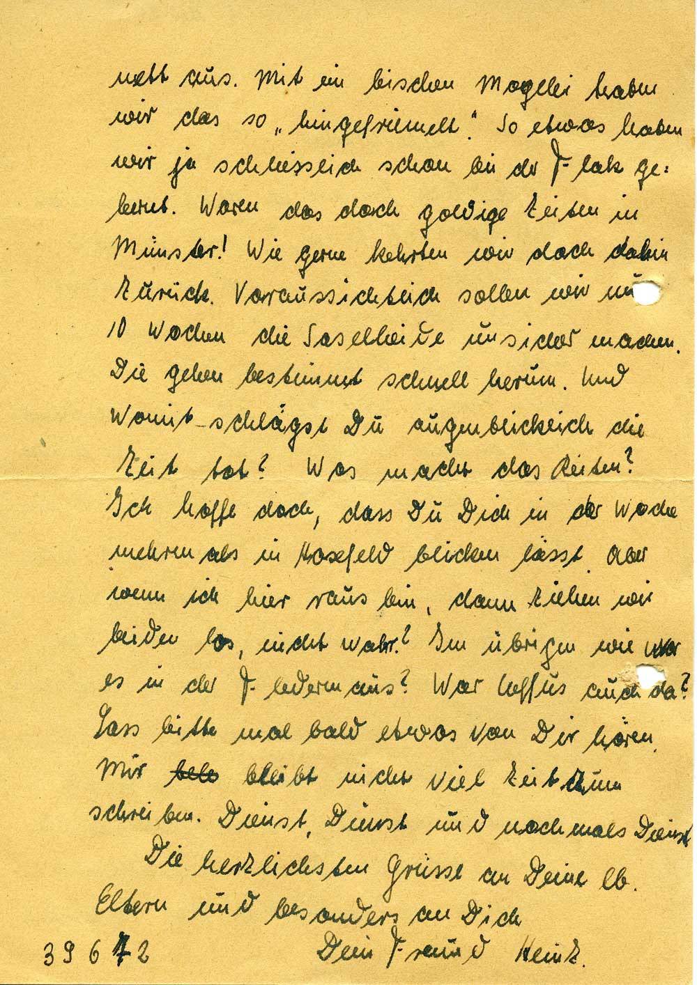 nett aus. Mit ein bischen Mogelei haben wir das so „hingefriemelt“. So etwas haben wir ja schliesslich schon bei der Flak gelernt. Waren das doch goldige Zeiten in Münster! Wie gerne kehrten wir doch dahin zurück. Voraussichtlich sollen wir nun 10 Wochen die Saselheide unsicher machen. Die gehen bestimmt schnell herum. Und womit schlägst Du augenblicklich die Zeit tot? Was macht das Reiten? Ich hoffe doch, dass Du Dich in der Woche mehrmals in Hosefeld blicken lässt. Aber wenn ich hier raus bin, dann ziehen wir beiden los, nicht wahr? Im übrigen wie war es in der Fledermaus? War Coffus auch da? Lass bitte mal bald etwas von Dir hören. Mir bleibt nicht viel Zeit zum schreiben. Dienst, Dienst und nochmals Dienst.