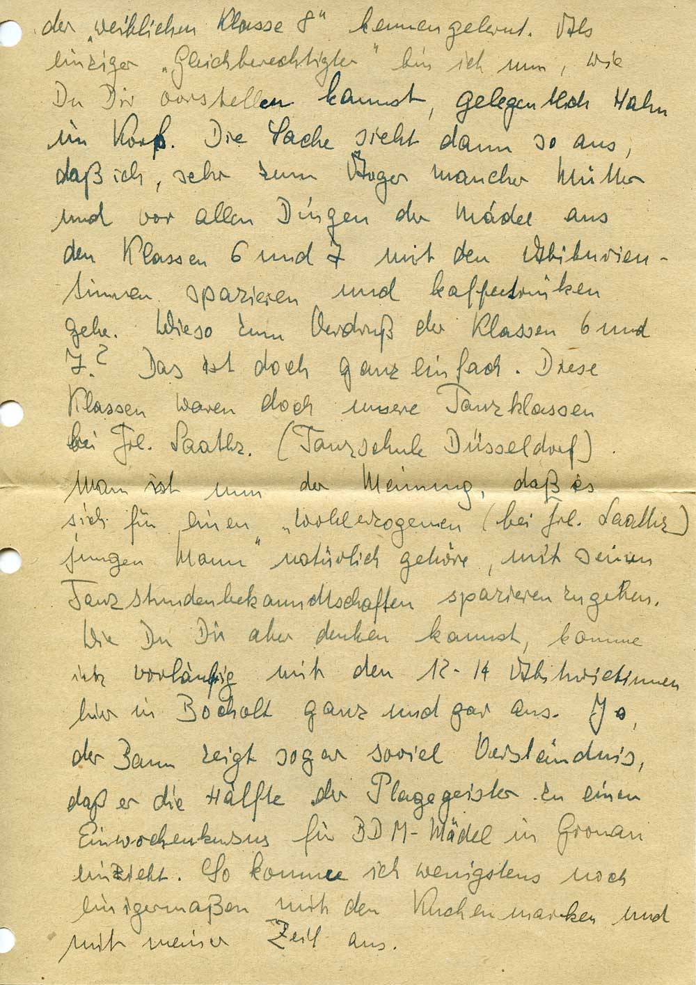 der „weiblichen Klasse 8“ kennengelernt. Als einziger „Gleichberechtigter“ bin ich nun, wie Du Dir vorstellen kannst, gelegentlich Hahn im Korb. Die Sache sieht dann so aus, daß ich, sehr zum Ärger mancher Mütter und vor allen Dingen der Mädel aus den Klassen 6 und 7 mit den Abiturientinnen spazieren und kaffeetrinken gehe. Wieso zum Verdruß der Klassen 6 und 7? Das ist doch ganz einfach. Diese Klassen waren doch unsere Tanzklassen bei Frl. Laathz. (Tanzschule Düsseldorf). Man ist nun der Meinung, daß es sich für einen „wohlerzogenen (bei Frl. Laathz.) jungen Mann“ natürlich gehöre, mit seinen Tanzstundenbekanntschaften spazieren zu gehen. Wie Du Dir aber denken kannst, komme ich vorläufig mit den 12-14 Abiturientinnen hier in Bocholt ganz und gar aus. Ja, der Bann zeigt sogar soviel Verständnis, daß er die Hälfte der Plagegeister zu einem Einwochenkursus für BDM-Mädel in Gronau einzieht. So komme ich wenigstens noch einigermaßen mit den Kuchenmarken und mit meiner Zeit aus.