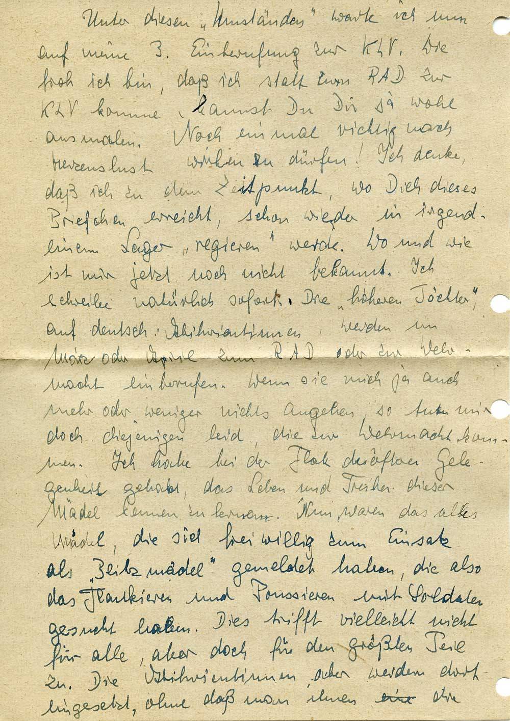 Unter diesen „Umständen“ warte ich nun auf meine 3. Einberufung zur KLV. Wie froh ich bin, daß ich statt zum RAD zur KLV komme, kannst Du Dir ja wohl ausmalen. Noch einmal richtig nach Herzenslust wirken zu dürfen! Ich denke, daß ich zu dem Zeitpunkt, wo Dich dieses Briefchen erreicht, schon wieder in irgendeinem Lager „regieren“ werde. Wo und wie ist mir jetzt noch nicht bekannt. Ich schreibe natürlich sofort. Die „höheren Töchter“, auf deutsch: Abiturientinnen, werden im März oder April zum RAD oder zur Wehrmacht einberufen. Wenn sie mich ja auch mehr oder weniger nichts angehen, so tuen mir doch diejenigen leid, die zur Wehrmacht kommen. Ich habe bei der Flak des öfteren Gelegenheit gehabt, das Leben und Treiben dieser Mädel kennen zu lernen. Nun waren das alles Mädel, die sich freiwillig zum Einsatz als „Blitzmädel“ gemeldet haben, die also das Flankieren und Poussieren mit Soldaten gesucht haben. Dies trifft vielleicht nicht für alle, aber doch für den größten Teil zu. Die Abiturientinnen aber werden dort eingesetzt, ohne daß man ihnen die