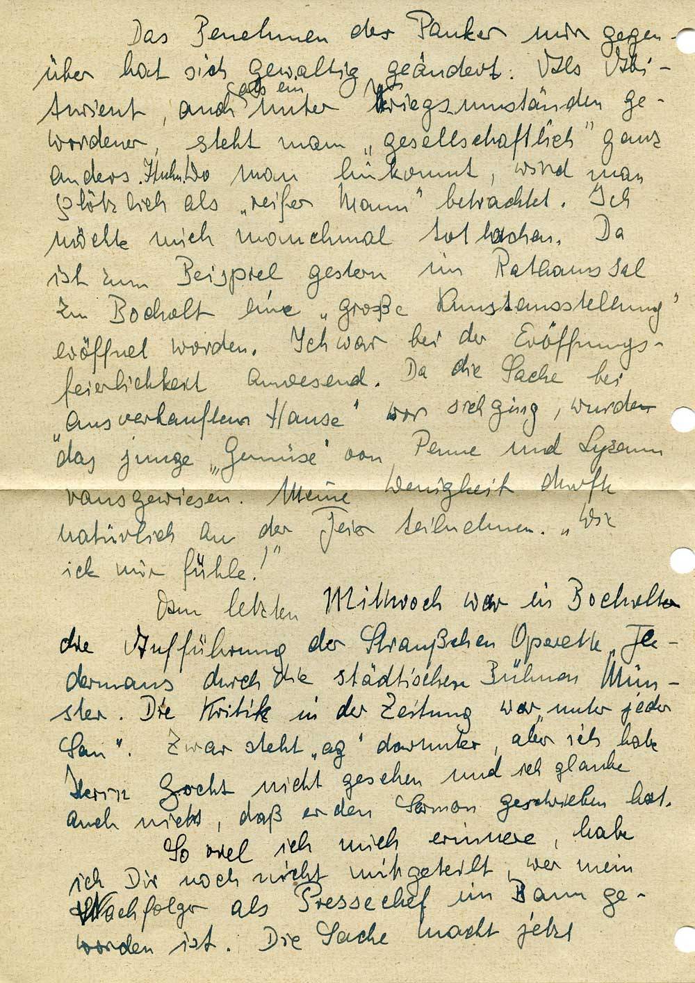 Das Benehmen der Pauker mir gegenüber hat sich gewaltig geändert. Als Abiturient, auch als ein unter Kriegsumständen gewordener, steht man „gesellschaftlich“ ganz anders. Huhu. Wo man hinkommt, wird man plötzlich als „reifer Mann“ betrachtet. Ich möchte mich manchmal totlachen. Da ist zum Beispiel gestern im Rathaussal zu Bocholt eine „große Kunstausstellung“ eröffnet worden. Ich war bei der Eröffnungsfeierlichkeit anwesend. Da die Sache bei „ausverkauftem Hause“ vor sich ging, wurde das junge „Gemüse“ von Penne und Lyzeum rausgewiesen. Meine Wenigkeit durfte natürlich an der Feier teilnehmen. „Wie ick mir fühle!“