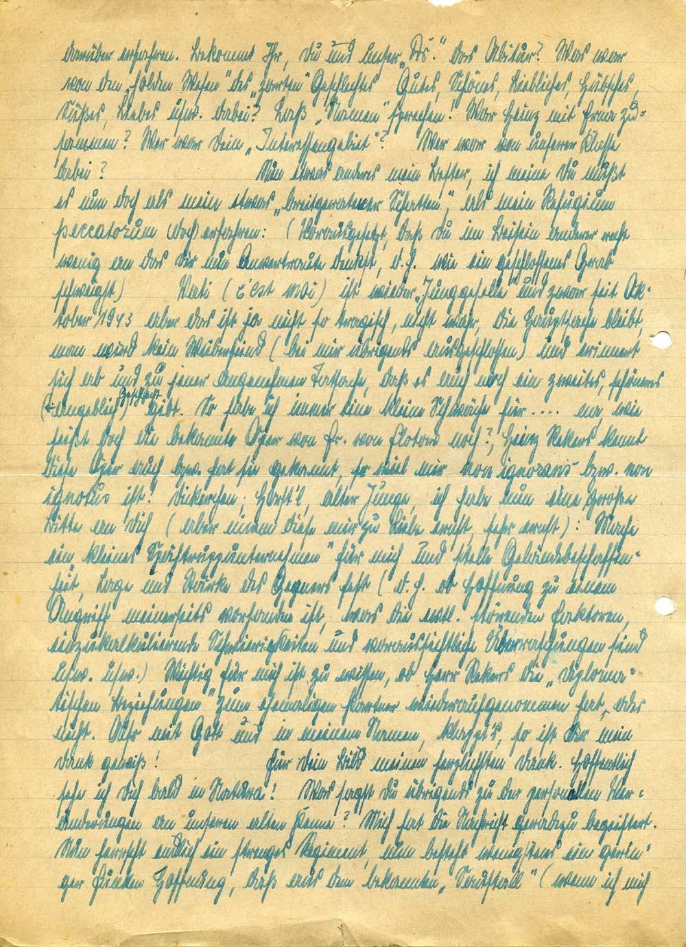 darüber erfahren. Bekommt Ihr, Du und unser „Dr.“ das Abitur? Was war von den „holden Wesen“ des „zarten“ Geschlechtes Gutes, Schönes, Liebliches, Hübsches, Süßes, Liebes usw. dabei? Laß „Namen“ sprechen! War Heinz mit Erna zusammen? Wer war Dein „Interessengebiet“? Wer war von unserer Klasse dabei? Nun etwas anderes mein Bester, ich meine Du mußt es nun doch als mein etwas „breitgeratener Schatten“, als mein Refugium peccatorum erfahren: (Vorausgesetzt, daß Du im Beisein anderer recht wenig an das Dir nun Anvertraute denkst, d. h. wie ein geschlossenes Grab schweigst) Vati (c’est moi) ist wieder „Junggeselle“ und zwar seit Oktober 1943 aber das ist ja nicht so tragisch, nicht wahr, die Hauptsache bleibt, man wird kein Weiberfeind (bei mir übrigends ausgeschlossen) und erinnert sich ab und zu jener angenehmen Tatsache, daß es auch noch ein zweites, schöneres (<angeblich) Geschlecht gibt. So habe ich immer eine kleine Schwäche für .... na, wie heißt doch die bekannte Opfer von Fr. von Flotow noch? Heinz Rekers kennt diese Oper auch bzw. hat sie gekannt, so viel mir non ignorans bzw. non ignotus ist! Dickerchen; Horst’l, alter Junge, ich habe nun eine große Bitte an Dich (aber einem diese mir zu Liebe ernst, sehr ernst): Mache ein „kleines Spähtruppunternehmen“ für mich und stelle Geländebeschaffenheit, Lage und Stärke des Gegners fest (d. h. ob Hoffnung zu einem Angriff meinerseits vorhanden ist, was die evtl. störenden Faktoren, einzukalkulierende Schwierigkeiten und voraussichtliche Überraschungen sind usw. usw.) Wichtig für mich ist zu wissen, ob Herr Rekers die „diplomatischen Beziehungen“ zum ehemaligen Partner wiederaufgenommen hat oder nicht. Also mit Gott und in meinem Namen, klappt’s, so ist Dir mein Dank gewiß! Für Dein Bild meinen herzlichen Dank. Hoffentlich sehe ich Dich bald in Natura! Was sagst Du übrigends