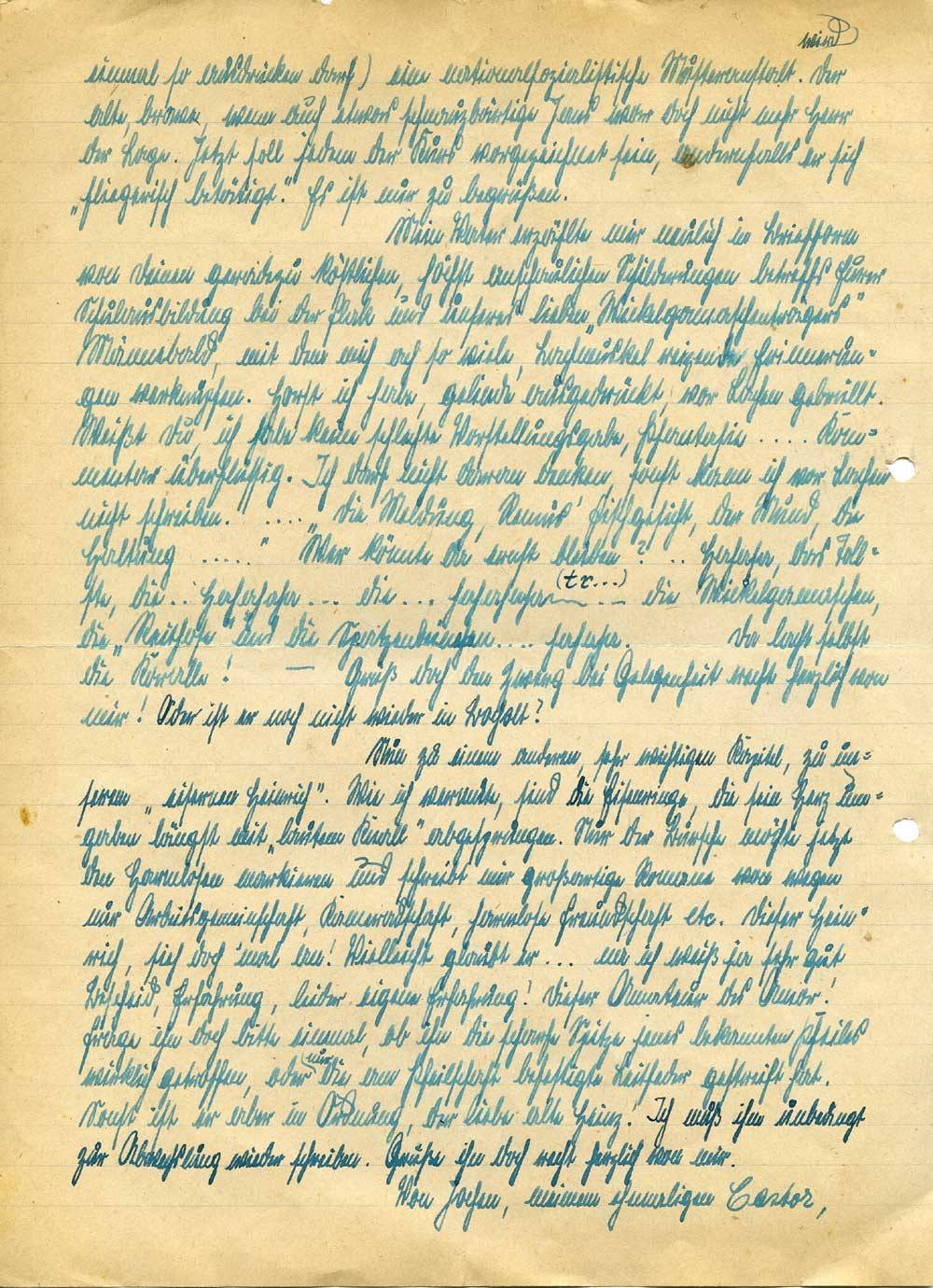 Nun zu einem anderen, sehr wichtigen Kapitel, zu unserem „eisernen Heinrich“. Wie ich vermute, sind die Eisenringe, die sein Herz umgaben längst mit „lautem Knall“ abgesprungen. Nur der Bursche möchte jetzt den Harmlosen markieren und schreibt mir großartige Romane von wegen nur Arbeitsgemeinschaft, Kameradschaft, harmlose Freundschaft etc. Dieser Heinrich, sieh doch ‘mal an! Vielleicht glaubt er ... na ich weiß ja sehr gut Bescheid, Erfahrung, leider eigene Erfahrung! Dieser Amateur des Amor! Frage ihn doch bitte einmal, ob ihn die scharfe Spitze jenes bekannten Pfeiles wirklich getroffen, oder nur die am Pfeilschaft befestigte Leitfeder gestreift hat. Sonst ist er aber in Ordnung, der liebe alte Heinz. Ich muß ihm unbedingt zur Abwechslung wieder schreiben. Grüße ihn doch recht herzlich von mir.