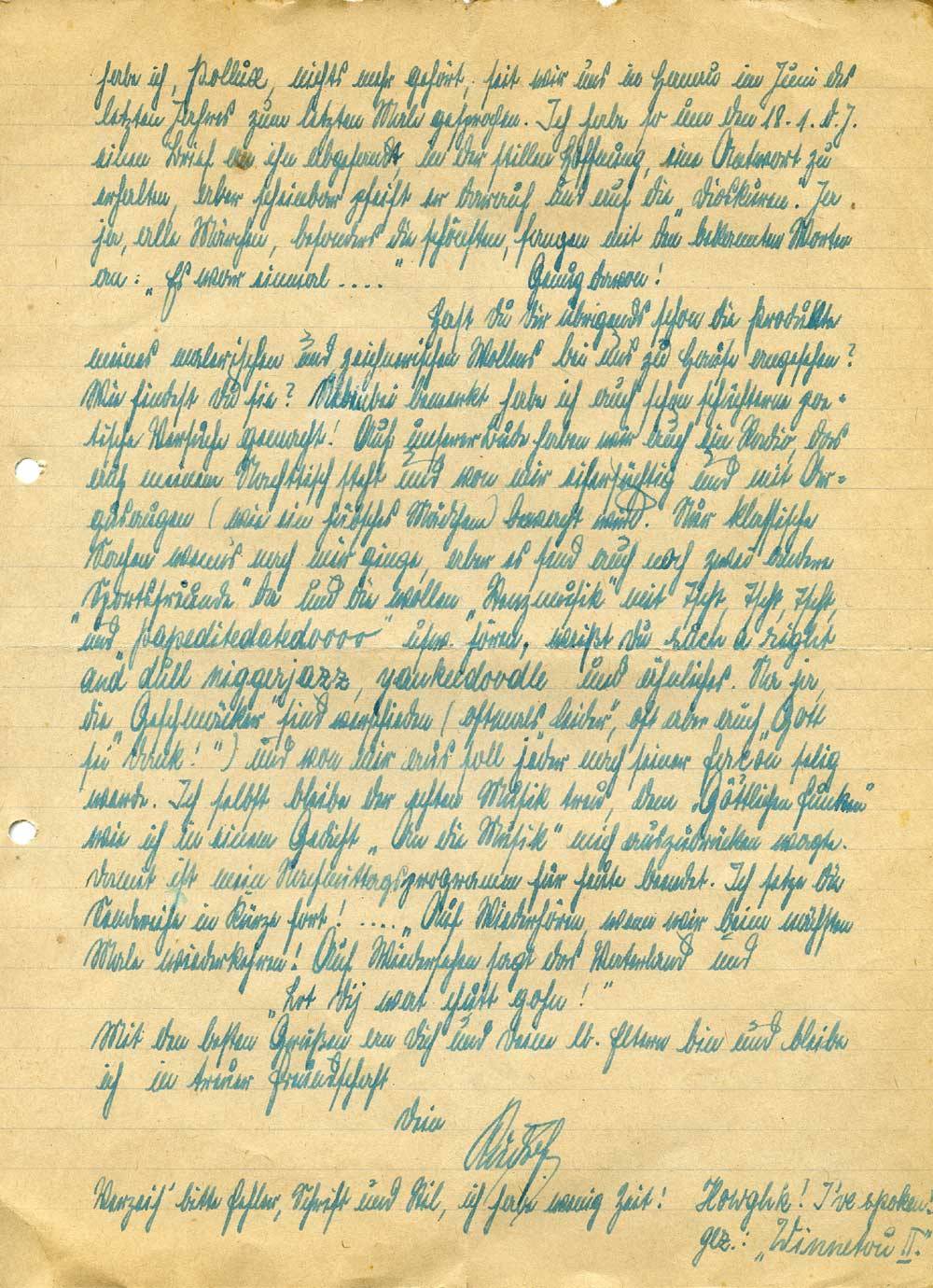 Hast Du Dir übrigends schon die Produkte meines malerischen und zeichnerischen Wollens bei uns zu Hause angesehen? Wie findest Du sie? Nebenbei bemerkt habe ich auch schon schüchterne poetische Versuche gemacht! Auf unserer Bude haben wir auch ein Radio, das auf meinem Nachtisch steht und von mir eifersüchtig und mit Argusaugen (wie ein hübsches Mädchen) bewacht wird. Nur klassische Sachen wenn’s nach mir ginge, aber es sind auch noch zwei andere „Sportsfreunde“ da und die wollen „Stenzmusik“ mit Tscht, Tscht, Tscht, und „Papeditedatedoooo“ usw. hören, weißt Du such a right an dull niggerjazz, yankeedoodle und ähnliches. Na ja, die „Geschmäcker“ sind verschieden (oftmals „leider“, oft aber auch „Gott sei Dank!“) und von mir aus soll jeder nach seiner Facon selig werden. Ich selbst bleibe der echten Musik treu, dem „Göttlichen Funken“ wie ich in einem Gedicht „An die Musik“ mich auszudrücken wagte. Damit ist mein Nachmittagsprogramm für heute beendet. Ich setze die Sendereihe in Kürze fort! .... „Auf Wiederhören, wenn wir beim nächsten Male wiederkehren! Auf Wiedersehen sagt das Vaterland und