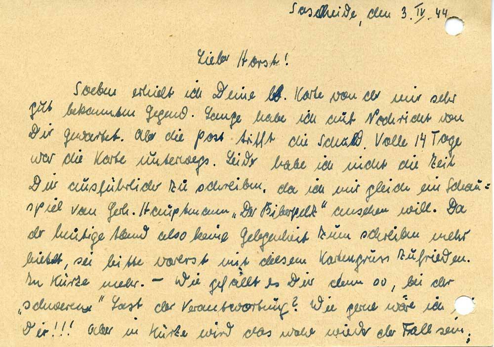Soeben erhielt ich Deine lb. Karte von der mir sehr gut bekannten Gegend. Lange habe ich auf Nachricht von Dir gewartet. Aber die Post trifft die Schuld. Volle 14 Tage war die Karte unterwegs. Leider habe ich nicht die Zeit Dir ausführlicher zu schreiben, da ich mir gleich ein Schauspiel von Gerh. Hauptmann „Der Biberpelz“ ansehen will. Da der heutige Abend also keine Gelegenheit zum schreiben mehr bietet, sei bitte vorerst mit diesem Kartengruss zufrieden. In Kürze mehr. – Wie gefällt es Dir denn so, bei der „schweren“ Last der Verantwortung? Wie gerne wäre ich bei Dir!!! Aber in Kürze wird das wohl wieder der Fall sein;