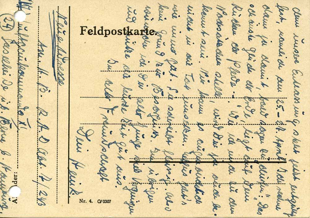 denn unsere Entlassung steht jetzt entgültig fest, nämlich am 25.-27. April. Ich rechne dann ja damit, bald sagen zu dürfen: „Das schönste Glück der Erde, liegt auf dem Rücken der Pferde.“ Wie ich mich zu dem [?] stelle, wird Dir ja auch bekannt sein. Nur kann es augenblicklich nicht in die Tat umsetzen. Kellus geht’s wie immer gut. Sie schreibt fleissig. Also kein Grund zur Besorgnis. Im übrigen wünsche ich Dir alter Junge viel Vergnügen und nütze die kurze Zeit gut aus.