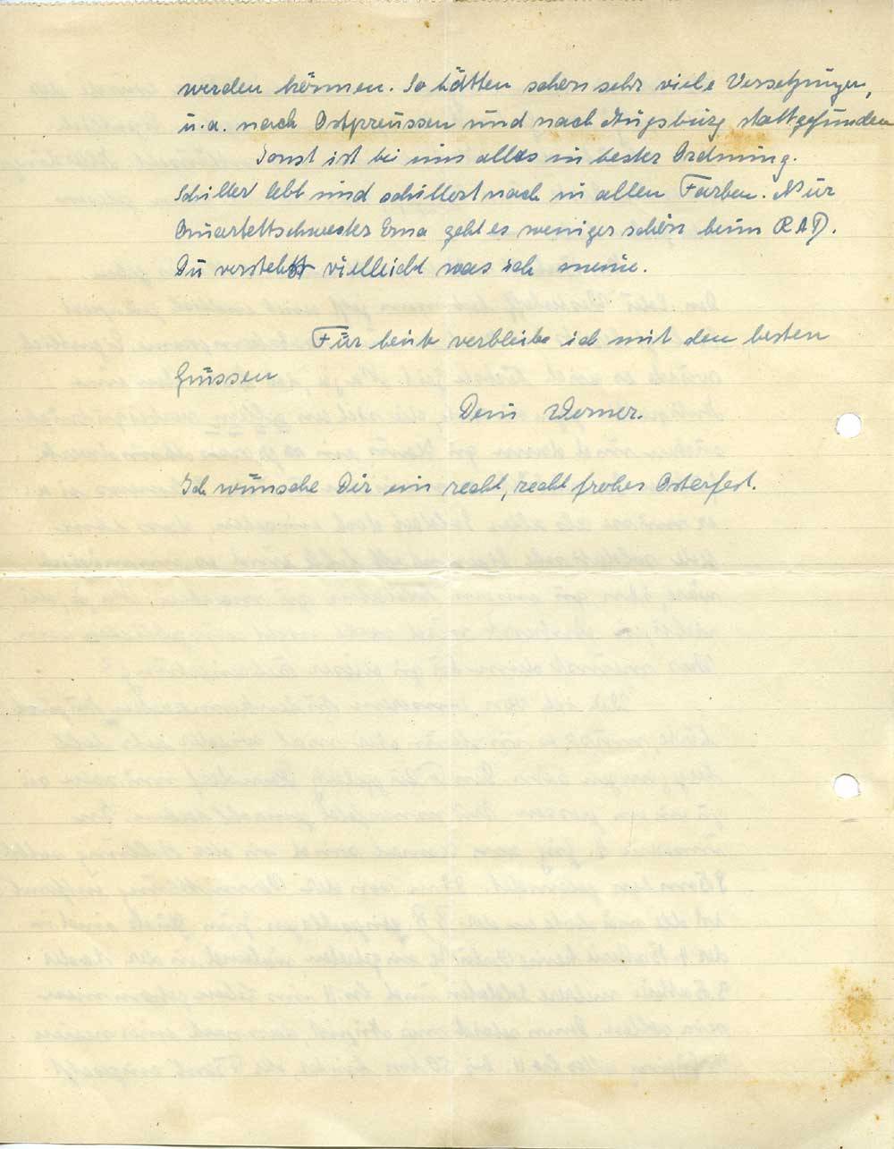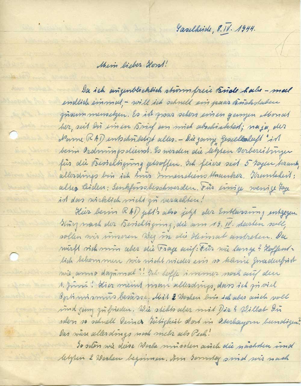 Hier beim RAD geht’s also jetzt der Entlassung entgegen. Kurz nach der Besichtigung, die am 19.IV. starten soll, sollen wir unseren Weg in die Heimat antreten. Da wirft sich nun aber die Frage auf: Für wie lange? Hoffentlich bekommen wir nicht wieder ein so kleine Gnadenfrist wie „anno dazumal“! Ich hoffe immer noch auf den 1. Juni! Hier meint man allerdings, dass ich zu viel Optimismus besässe. Mit 2 Wochen bin ich aber auch voll und ganz zufrieden. Wie stehts aber mit Dir? Willst Du schon so schnell Deine Tätigkeit dort in Oberbayern beendigen? Das wäre allerdings noch mehr als Pech!