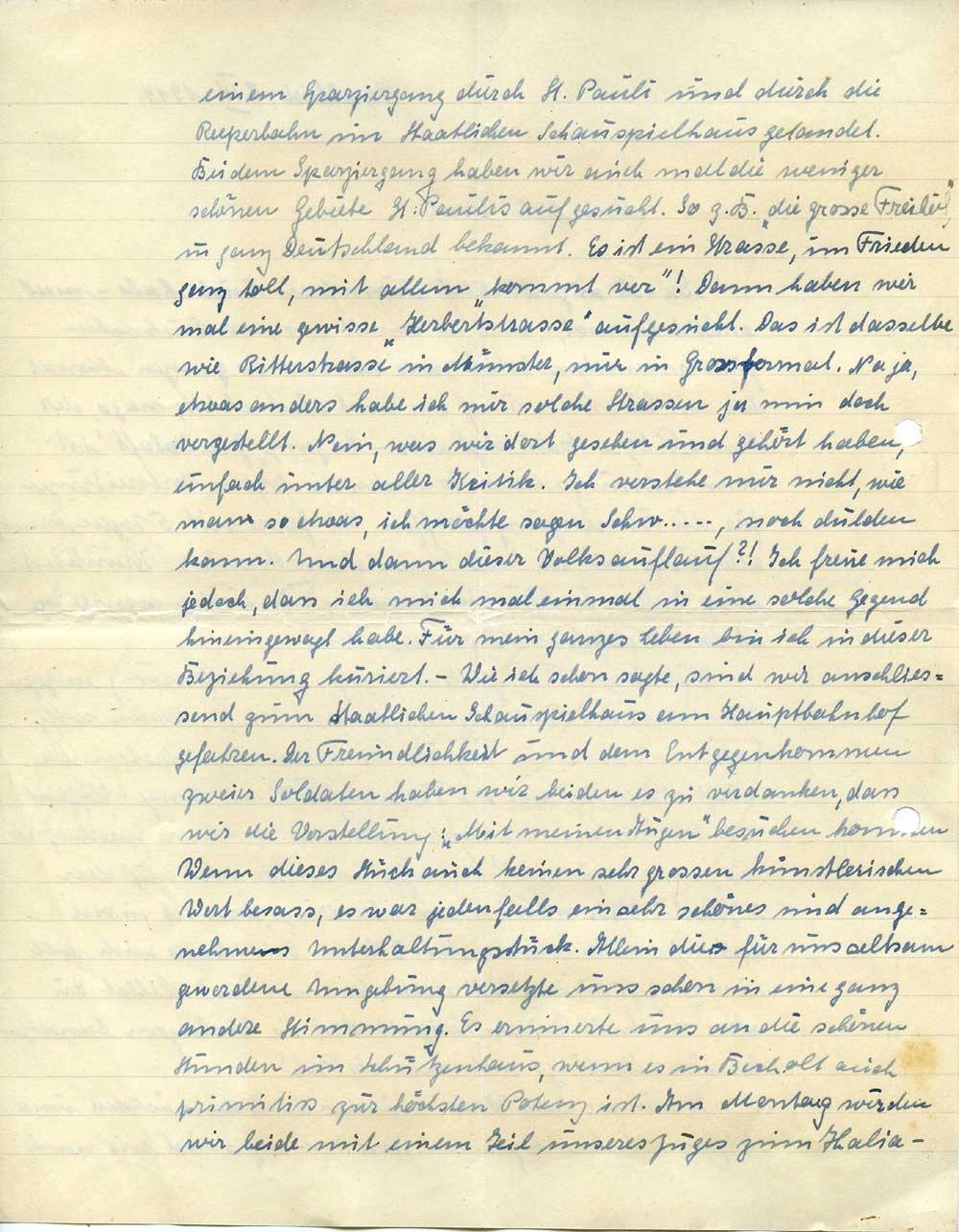 einem Spaziergang durch St. Pauli und durch die Reeperbahn im Staatlichen Schauspielhaus gelandet. Bei dem Spaziergang haben wir auch mal die weniger schönen Gebiete St. Paulis aufgesucht. So z. B. „die grosse Freiheit“, in ganz Deutschland bekannt. Es ist eine Strasse, im Frieden ganz toll, mit allem „kommt vor“! Dann haben wir mal eine gewisse „Herbertstrasse“ aufgesucht. Das ist dasselbe wie Ritterstrasse in Münster, nur in Grossformat. Naja, etwas anders habe ich mir solche Strassen ja nun doch vorgestellt. Nein, was wir dort gesehen und gehört haben, einfach unter aller Kritik. Ich verstehe nur nicht, wie man so etwas, ich möchte sagen Schw....., noch dulden kann. Und dann dieser Volksauflauf?! Ich freue mich jedoch, dass ich mich mal einmal in eine solche Gegend hineingewagt habe. Für mein ganzes Leben bin ich in dieser Beziehung kuriert. – Wie ich schon sagte, sind wir anschliessend zum Staatlichen Schauspielhaus am Hauptbahnhof gefahren. Der Freundlichkeit und dem Entgegenkommen zweier Soldaten haben wir beiden es zu verdanken, dass wir die Vorstellung: „Mit meinen Augen“ besuchen konnten. Wenn dieses Stück auch keinen sehr grossen künstlerischen Wert besass, es war jedenfalls ein sehr schönes und angenehmes Unterhaltungsstück. Allein die für uns seltsam gewordene Umgebung versetzte uns schon in eine ganz andere Stimmung. Es erinnerte uns an die schönen Stunden im Schützenhaus, wenn es in Bocholt auch primitiv zur höchsten Potenz ist. Am Montag wurden wir beide mit einem Teil unseres Zuges zum Thalia-