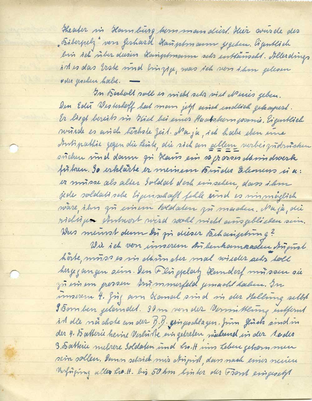 Wie ich von unserem Stubenkameraden August hörte, muss es in Münster mal wieder sehr toll hergegangen sein. Den Flugplatz Handorf müssen sie zu einem grossen Trümmerfeld gemacht haben. In unserem 4. Zug am Kanal sind in der Stellung selbst 9 Bomben gelandet. 30 m von der Vermittlung entfernt ist die nächste an der B.B. eingeschlagen. Zum Glück sind in der 4. Batterie keine Verluste eingetreten, während in der 1. oder 3. Batterie mehrere Soldaten und Lw.H. ums Leben gekommen sein sollen. Dann schrieb mir August, dass nach einer neuen Verfügung alle Lw.H. bis 50 km hinter der Front eingesetzt