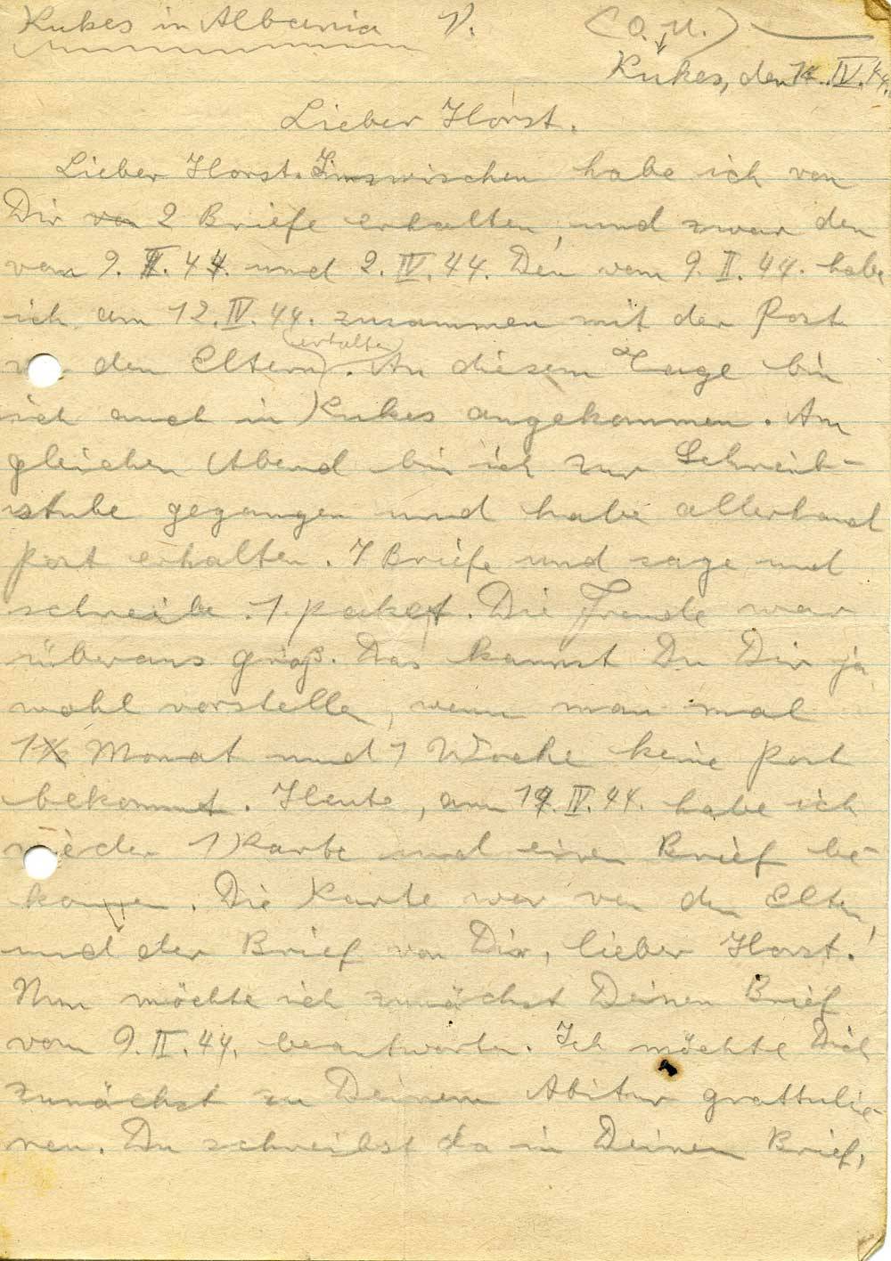 Lieber Horst. Inzwischen habe ich von Dir 2 Briefe erhalten, und zwar den vom 9.II.44. und 2.IV.44. Den vom 9.II.44 habe ich am 12.IV.44 zusammen mit der Post von den Eltern erhalten. An diesem Tage bin ich auch in Kukes angekommen. Am gleichen Abend bin ich zur Schreibstube gegangen und habe allerhand Post erhalten. 7 Briefe und sage und schreibe 1 Paket. Die Freude war überaus groß. Das kannst Du Dir ja wohl vorstellen, wenn man mal 1 Monat und 1 Woche keine Post bekommt. Heute, am 14.IV.44 habe ich wieder 1 Karte und einen Brief bekommen. Die Karte war von den Eltern, und der Brief von Dir, lieber Horst. Nun möchte ich zunächst Deinen Brief vom 9.II.44 beantworten. Ich möchte Dich zunächst zu Deinem Abitur grattulieren. Du schreibst da in Deinem Brief,