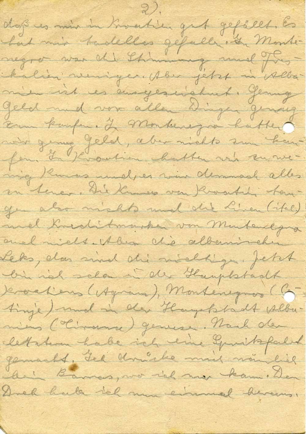daß es mir in Kroatien gut gefällt. Es hat mir tadellos gefallen. In Montenegro war die Stimmung und Freskalien weniger. Aber jetzt in Albanien ist es ausgezeichnet. Genug Geld und vor allen Dingen genug zum kaufen. In Montenegro hatten wir genug Geld, aber nichts zum kaufen. In Kroatien hatten wir zu wenig Kunas und es war demnach alles zu teuer. Die Kunas von Kroatien taugen also nichts und die Liren (ital.) und Kreditmarken von Montenegro auch nicht. Aber die albanischen Leks, das sind die richtigen. Jetzt bin ich schon in der Hauptstadt Kroatiens (Agram), Montenegros (Cetinje) und in der Hauptstadt Albaniens (Tirana) gewesen. Nach der letzteren habe ich eine Spritzfahrt gemacht. Ich drücke mich nämlich beim Barras, wo ich nur kann. Den Dreh habe ich nun einmal heraus.