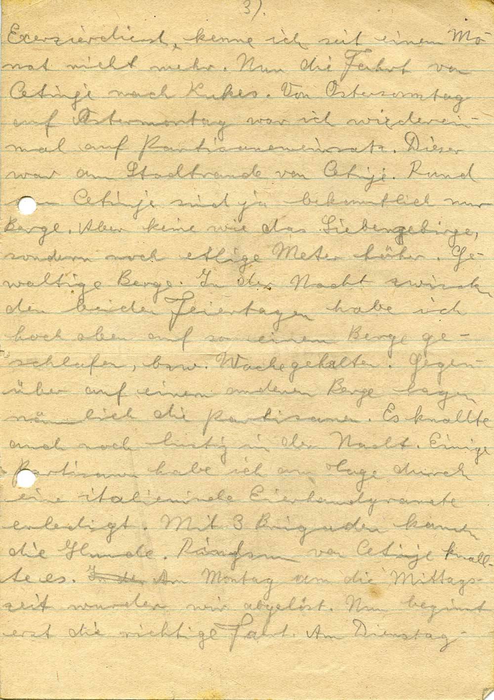 Exerzierdienst kenne ich seit einem Monat nicht mehr. Nun die Fahrt von Cetinje nach Kukes. Von Ostersonntag auf Ostermontag war ich wiedereinmal auf Partisaneneinsatz. Dieser war am Stadtrande von Cetinje. Rund um Cetinje sind ja bekanntlich nur Berge. Aber keine wie das Siebengebirge, sondern noch etlige Meter höher. Gewaltige Berge. In der Nacht zwischen den beiden Feiertagen habe ich hoch oben auf so einem Berge geschlafen, bzw. Wache gehalten. Gegenüber auf einem anderen Berge lagen nämlich die Partisanen. Es knallte auch noch lustig in der Nacht. Einige Partisamen habe ich am Tage durch eine italienische Eierhandgranate erledigt. Mit 3 Brigaden kommen die Hunde. Ringsum von Cetinje knallte es. Am Montag um die Mittagszeit wurden wir abgelöst. Nun beginnt erst die richtige Fahrt. Am Dienstag-