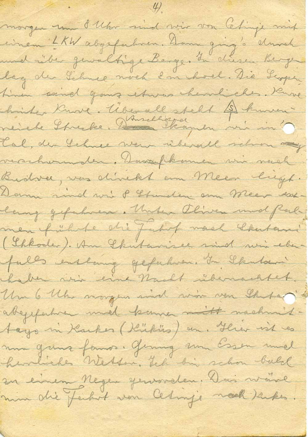 morgen um 8 Uhr sind wir von Cetinje mit einem LKW abgefahren. Dann ging’s durch und über gewaltige Berge. In diesen Bergen lag der Schnee noch 2 m hoch. Die Serpentinen sind ganz etwas herrliches. Kurve hinter Kurve. Überall steht ... kurvenreiche Strecke. Anschließend kamen wir in ein Tal, der Schnee war überall schon verschwunden. Darauf kamen wir nach Budva, was direkt am Meer liegt. Dann sind wir 8 Stunden am Meer entlang gefahren. Unter Oliven und Palmen führte die Fahrt nach Skutari (Shkoder). Am Skutarisee sind wir ebenfalls entlang gefahren. In Skutari haben wir eine Nacht übernachtet. Um 6 Uhr morgens sind wir von Skutari abgefahren und kamen nachmittags in Kukes (Küküs) an. Hier ist es nun ganz famos. Genug zum Essen und herrliches Wetter. Ich bin schon bald zu einem Neger geworden. Das wäre nun die Fahrt von Cetinje nach Kukes.