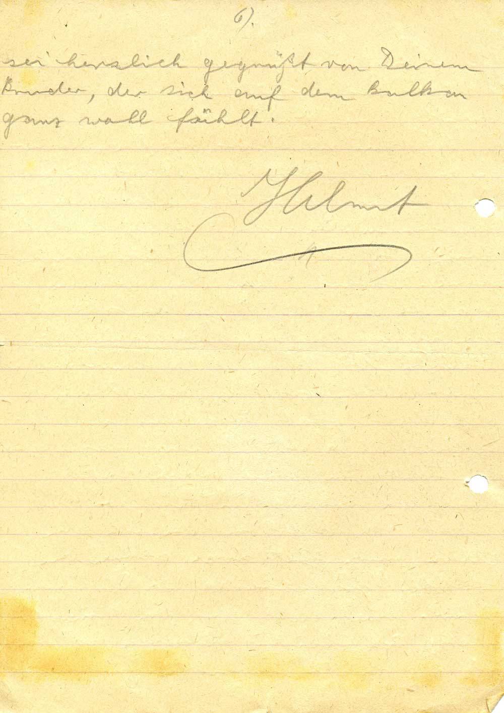 Ich freue mich sehr, daß Du wieder in die KLV gefahren bist. Da hast Du ja noch ein ganz tadelloses Lager bekommen. Du schreibst da in diesem Brief, daß ich Land u. Leute kennenlerne. Darauf kannst Du verlassen. Ich verstehe gut mit ihnen umzugehen. Nun sitze ich nicht mehr in der Hauptstadt Montenegros, sondern in einer Albaniens. Das Jochen Kraatz gefallen ist, hat Vater mir schon geschrieben. Ja, es ist sehr traurig. Auf der Fahrt von Cetinje nach Kukes kamen auch die englischen Flieger. Nun möchte ich schließen, da ich den Eltern nun auch noch schreiben wollte. Nun schreibe ich Dir aber öfter. Deine Feldpostnr. von Münster hatte ich leider vergessen, so konnte ich Dir nicht schreiben. Für heute