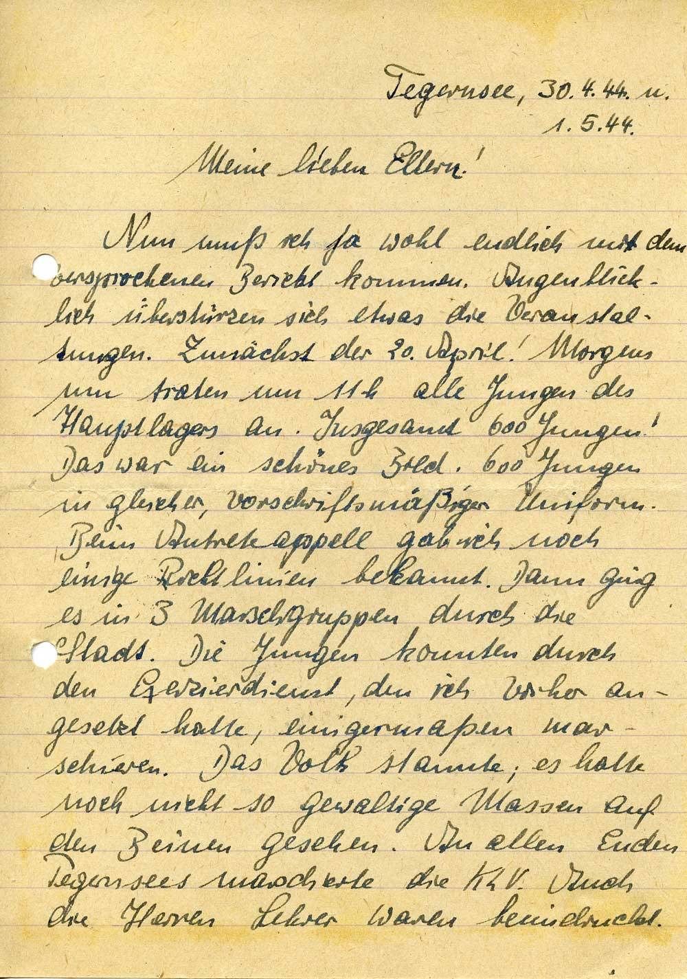 Nun muß ich ja wohl endlich mit dem versprochenen Bericht kommen. Augenblicklich überstürzen sich etwas die Veranstaltungen. Zunächst der 20. April! Morgens um traten um 11 h alle Jungen des Hauptlagers an. Insgesamt 600 Jungen! Das war ein schönes Bild. 600 Jungen in gleicher, vorschriftsmäßiger Uniform. Beim Antreteappell gab ich noch einige Richtlinien bekannt. Dann ging es in 3 Marschgruppen durch die Stadt. Die Jungen konnten durch den Exerzierdienst, den ich vorher angesetzt hatte, einigermaßen marschieren. Das Volk staunte; es hatte noch nicht so gewaltige Massen auf den Beinen gesehen. An allen Enden Tegernsees marschierte die KLV. Auch die Herren Lehrer waren beeindruckt.