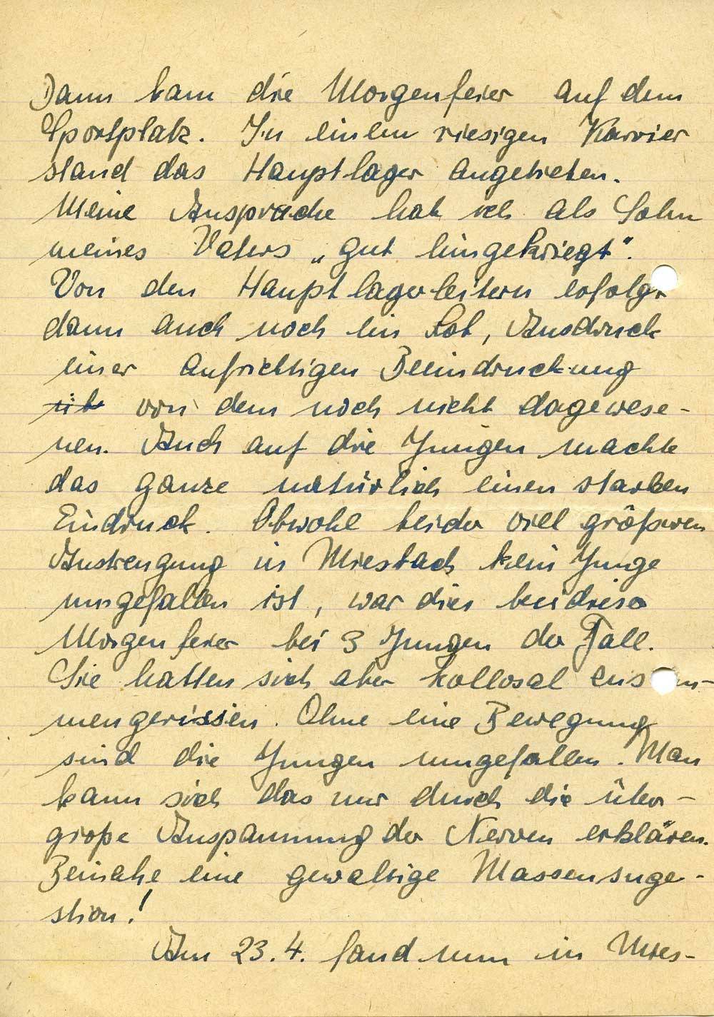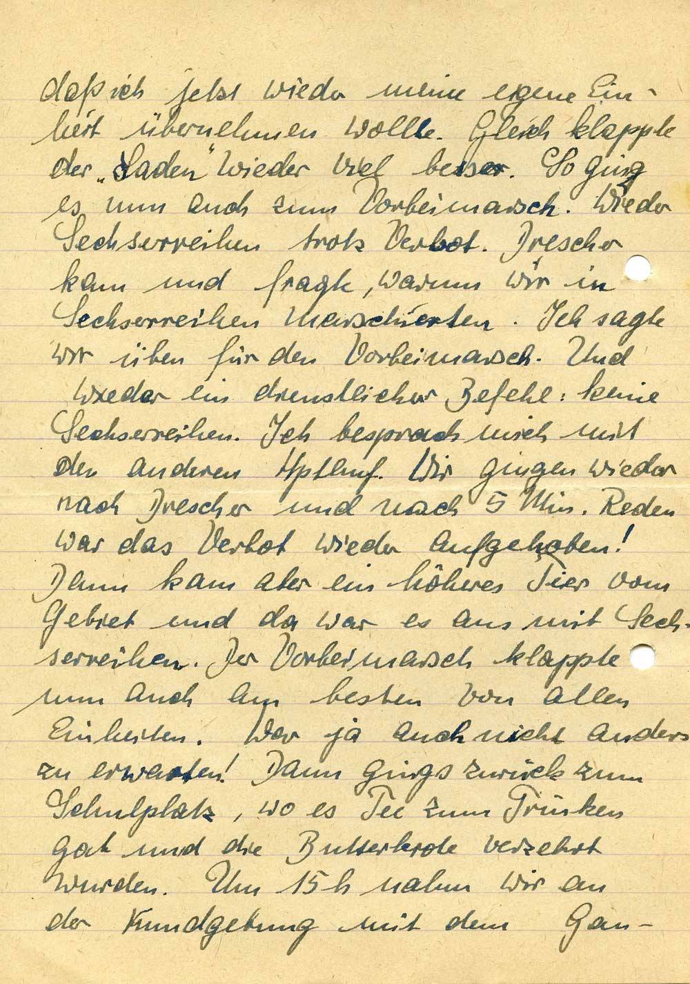 daß ich jetzt wieder meine eigene Einheit übernehmen wollte. Gleich klappte der „Laden“ wieder viel besser. So ging es nun auch zum Vorbeimarsch. Wieder Sechserreihen trotz Verbot. Drescher kam und fragte, warum wir in Sechserreihen marschierten. Ich sagte wir üben für den Vorbeimarsch. Und wieder ein dienstlicher Befehl: keine Sechserreihen. Ich besprach mich mit den anderen Hptlmf. Wir gingen wieder nach Drescher und nach 5 Min. Reden war das Verbot wieder aufgehoben! Dann kam aber ein höheres Tier vom Gebiet und da war es aus mit Sechserreihen. Der Vorbeimarsch klappte nun auch am besten von allen Einheiten. War ja auch nicht anders zu erwarten! Dann gings zurück zum Schulplatz, wo es Tee zum Trinken gab und die Butterbrote verzehrt wurden. Um 15 h nahm wir an der Kundgebung mit dem Gau-