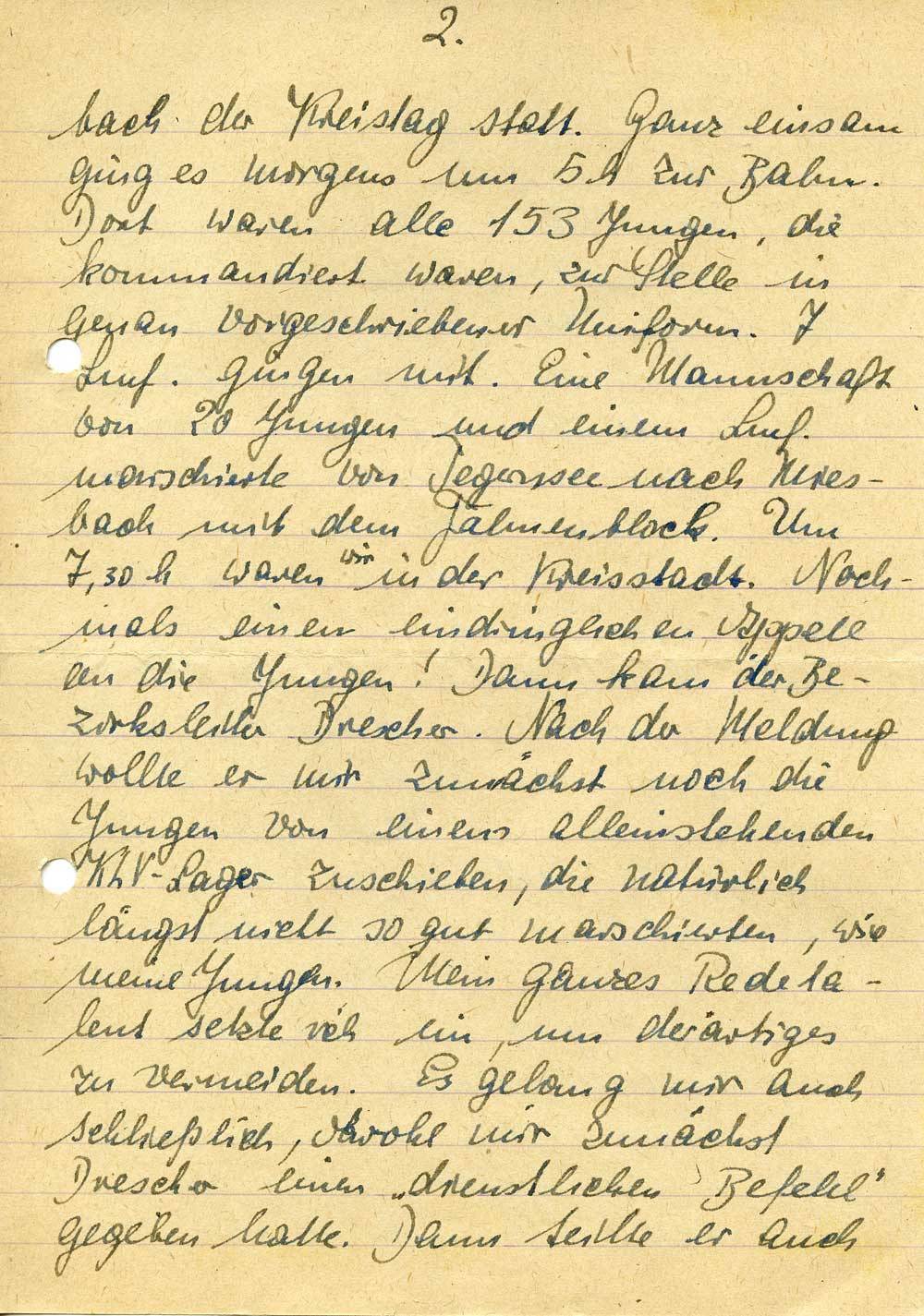 bach der Kreistag statt. Ganz einsam ging es morgens um 5 h zur Bahn. Dort waren alle 153 Jungen, die kommandiert waren, zur Stelle in genau vorgeschriebener Uniform. 7 Lmf. gingen mit. Eine Mannschaft von 20 Jungen und einem Lmf. marschierte von Tegernsee nach Miesbach mit dem Fahnenblock. Um 7.30 h waren wir in der Kreisstadt. Nochmals einen eindringlichen Appell an die Jungen! Dann kam der Bezirksleiter Drescher. Nach der Meldung wollte er mir zunächst noch die Jungen von einem alleinstehenden KLV-Lager zuschieben, die natürlich längst nicht so gut marschierten, wie meine Jungen. Mein ganzes Redetalent setzte ich ein, um derartiges zu vermeiden. Es gelang mir auch schließlich, obwohl mir zunächst Drescher einen „dienstlichen Befehl“ gegeben hatte. Dann teilte er auch