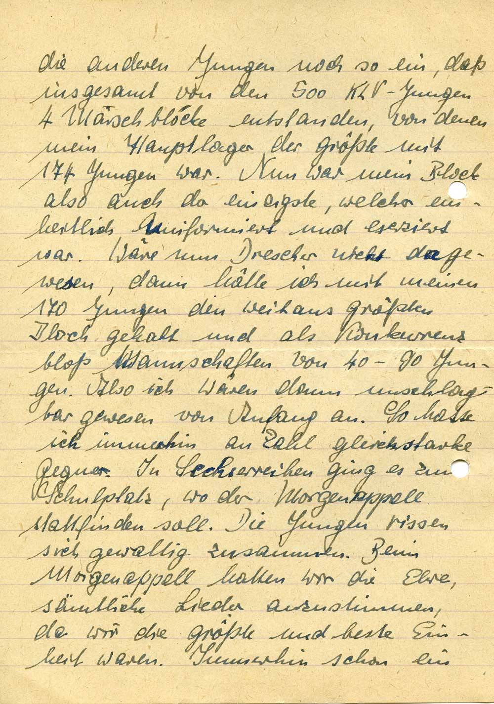 die anderen Jungen noch so ein, daß insgesamt von den 500 KLV-Jungen 4 Marschblöcke entstanden, von denen mein Hauptlager der Größte mit 174 Jungen war. Nun war mein Block also auch der einzigste, welcher einheitlich uniformiert und exerziert war. Wäre nun Drescher nicht dagewesen, dann hätte ich mit meinen 170 Jungen den weitaus größten Block gehabt und als Konkurrenz bloß Mannschaften von 40-90 Jungen. Also ich wären dann unschlagbar gewesen von Anfang an. So hatte ich immerhin an Zahl gleichstarke Gegner. In Sechserreihen ging es zum Schulplatz, wo der Morgenappell stattfinden soll. Die Jungen rissen sich gewaltig zusammen. Beim Morgenappell hatten wir die Ehre, sämtliche Lieder anzustimmen, da wir die größte und beste Einheit waren. Immerhin schon ein