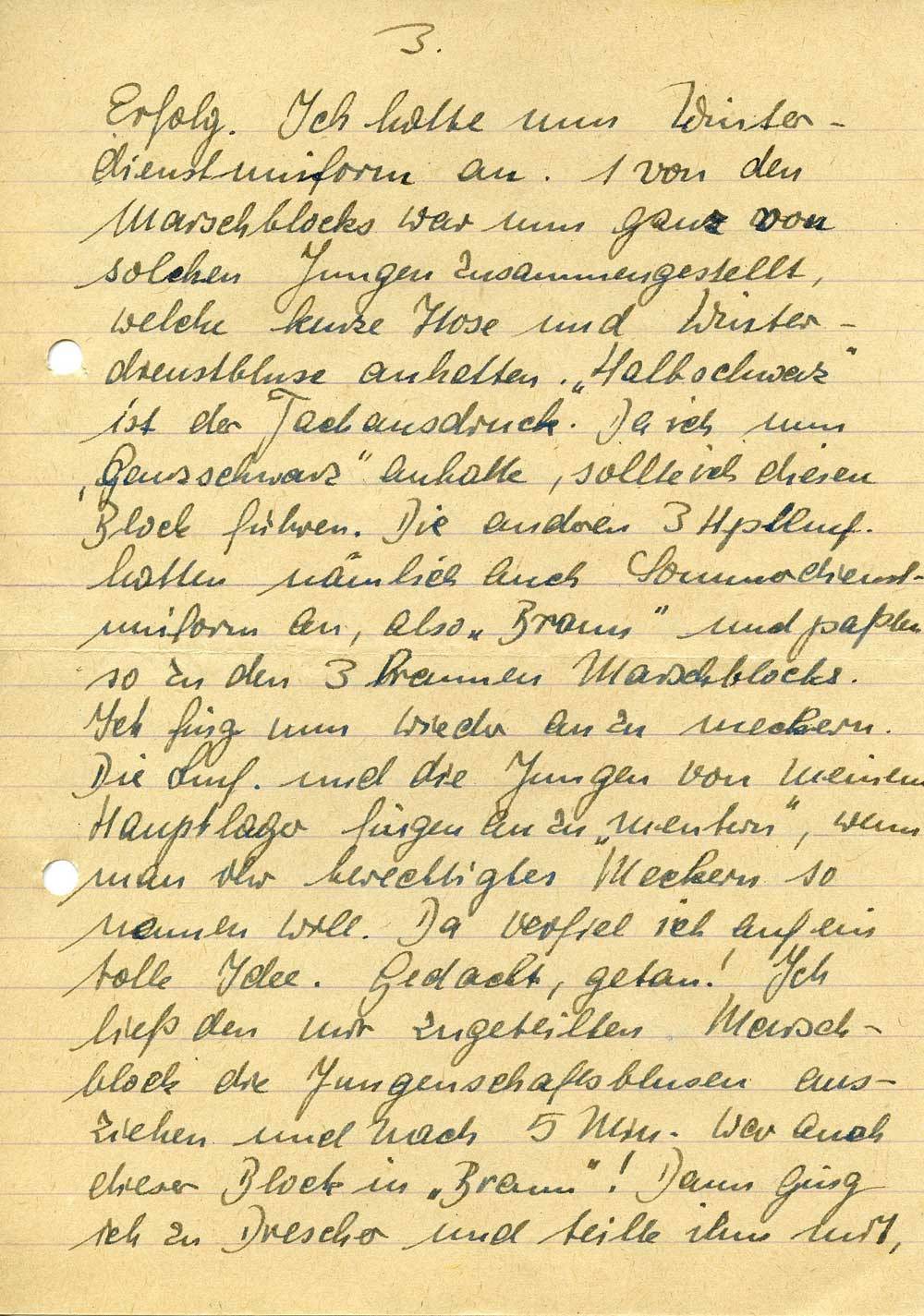 Erfolg. Ich hatte nun Winterdienstuniform an. 1 von den Marschblocks war nun ganz von solchen Jungen zusammengestellt, welche kurze Hose und Winterdienstbluse anhatten. „Halbschwarz“ ist der Fachausdruck. Da ich nun „Ganzschwarz“ anhatte, sollte ich diesen Block führen. Die anderen 3 Hptlmf. hatten nämlich auch Sommerdienstuniform an, also „Braun“ und paßten so zu den 3 braunen Marschblocks. Ich fing nun wieder an zu meckern. Die Lmf. und die Jungen von meinem Hauptlager fingen an zu „meutern“, wenn man ihr berechtigtes Meckern so nennen will. Da verfiel ich auf ein tolle Idee. Gedacht, getan! Ich ließ den mir zugeteilten Marschblock die Jungenschaftsblusen ausziehen und nach 5 Min. war auch dieser Block in „Braun“! Dann ging ich zu Drescher und teilte ihm mit,