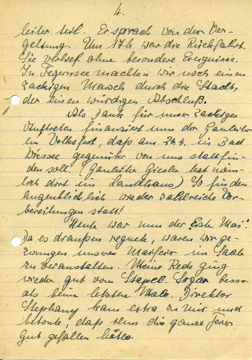 Heute war nun der „Erste Mai“. Da es draußen regnete, waren wir gezwungen unsere Maifeier im Saale zu veranstalten. Meine Rede ging wieder gut vom Stapel. Sogar besser als beim letzten Male. Direktor Stephany kam extra zu mir und betonte, daß ihm die ganze Feier gut gefallen hätte.