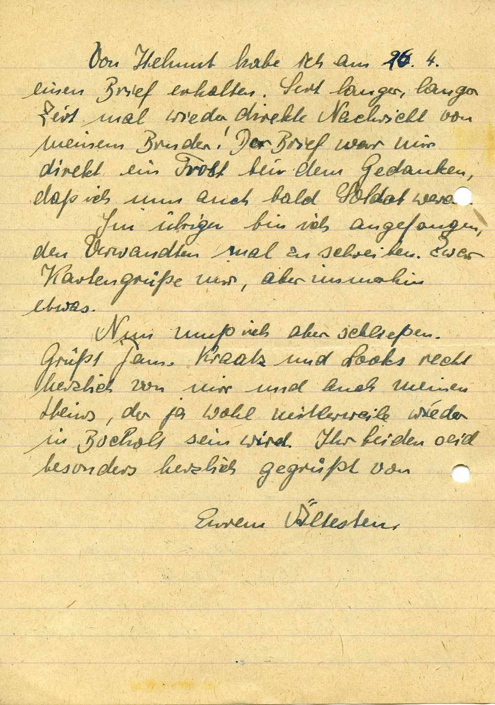 Von Helmut habe ich am 16.4. einen Brief erhalten. Seit langer, langer Zeit mal wieder direkte Nachricht von meinem Bruder! Der Brief war mir direkt ein Trost bei dem Gedanken, daß ich nun auch bald Soldat werde.