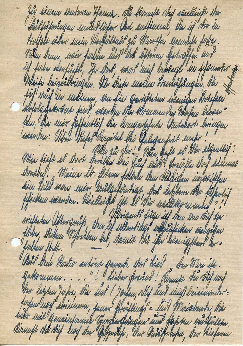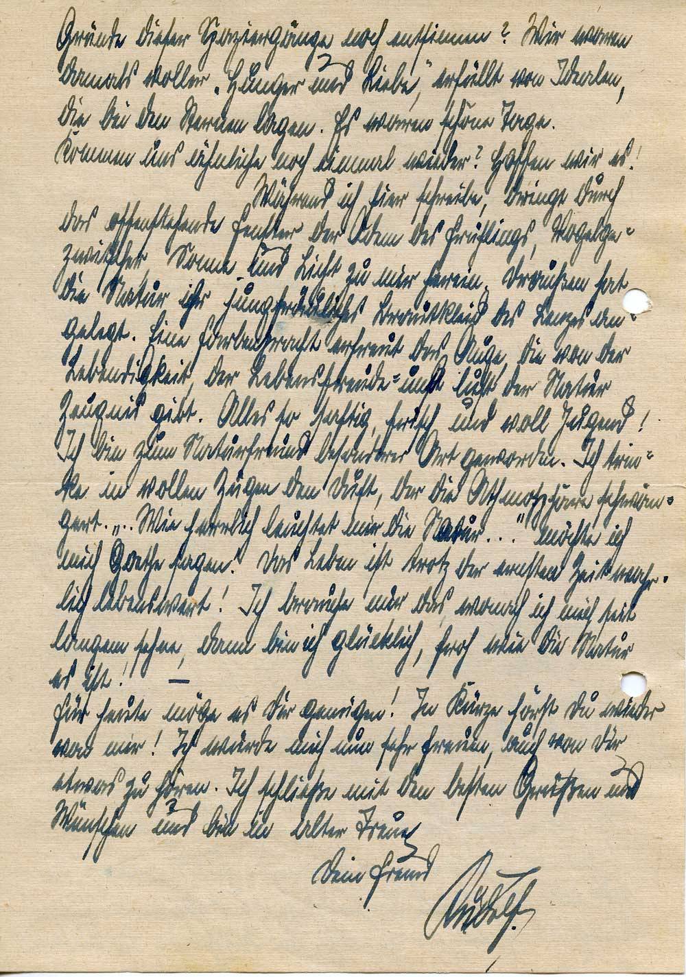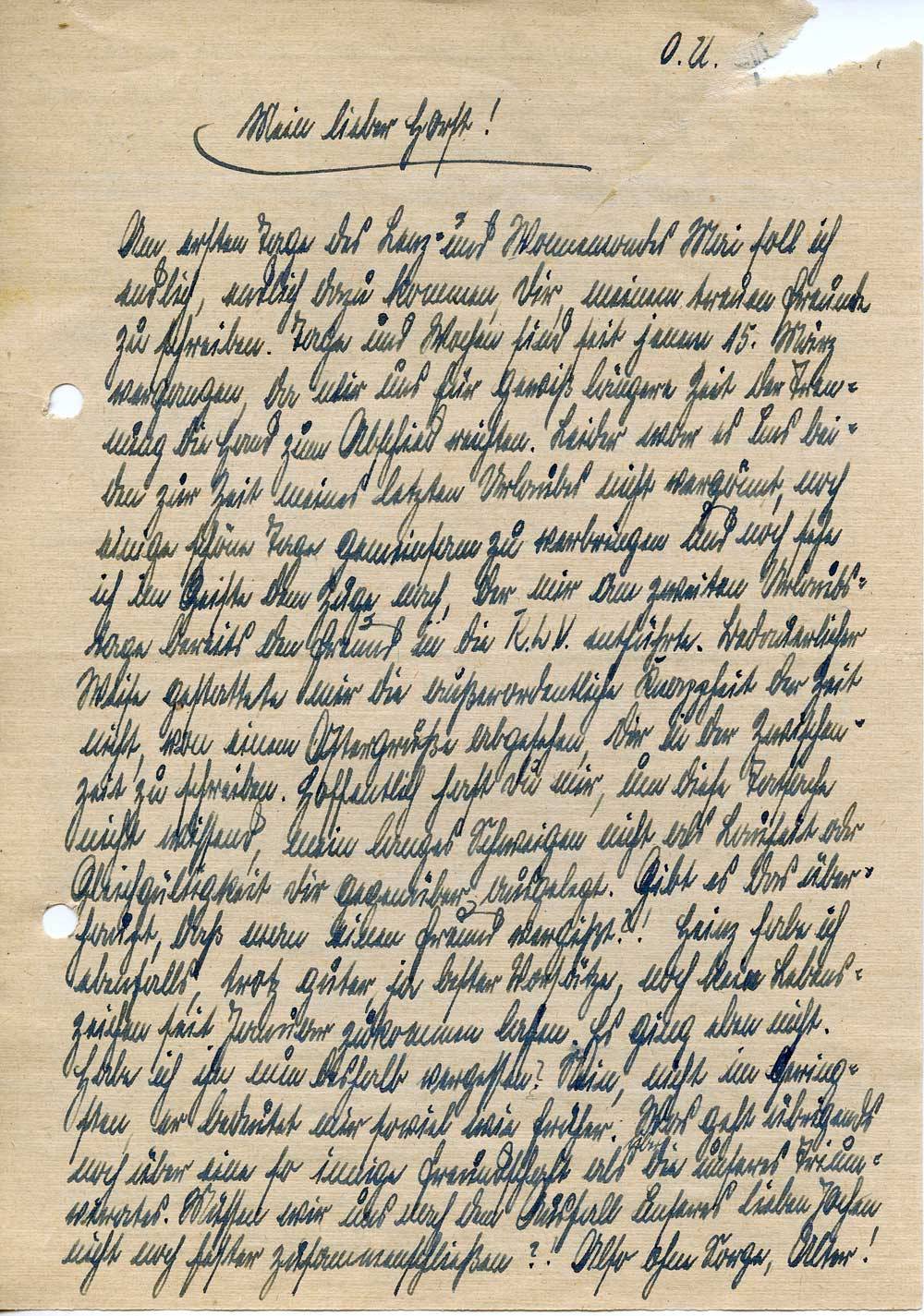Am ersten Tage des Lenz- und Wonnemonates Mai soll ich endlich, endlich dazu kommen, Dir, meinem treuen Freunde zu schreiben. Tage und Wochen sind seit jenem 15. März vergangen, da wir uns für gewiß längere Zeit der Trennung die Hand zum Abschied reichten. Leider war es uns beiden zur Zeit meines letzten Urlaubes nicht vergönnt, noch einige schöne Tage gemeinsam zu verbringen und noch sehe ich im Geiste dem Zuge nach, der mir am zweiten Urlaubstage bereits den Freund in die K.L.V. entführte. Bedauerlicher Weise gestattete mir die außerordentliche Knappheit der Zeit nicht, von einem Ostergruße abgesehen, Dir in der Zwischenzeit zu schreiben. Hoffentlich hast Du mir, um diese Tatsache nicht wissend, mein langes Schweigen nicht als Lauheit oder Gleichgültigkeit Dir gegenüber ausgelegt. Gibt es das überhaupt, daß man einen Freund vergißt?! Heinz habe ich ebenfalls, trotz guter, ja bester Vorsätze, noch kein Lebenszeichen seit Januar zukommen lassen. Es ging eben nicht. Habe ich ihn nun deshalb vergessen? Nein, nicht im Geringsten, er bedeutet mir soviel wie früher. Was geht übrigends noch über eine so innige Freundschaft als über die unseres Triumvirates. Müssen wir uns nach dem Ausfall unseres lieben Jochen nicht noch fester zusammenschließen?! Also ohne Sorge, Alter!