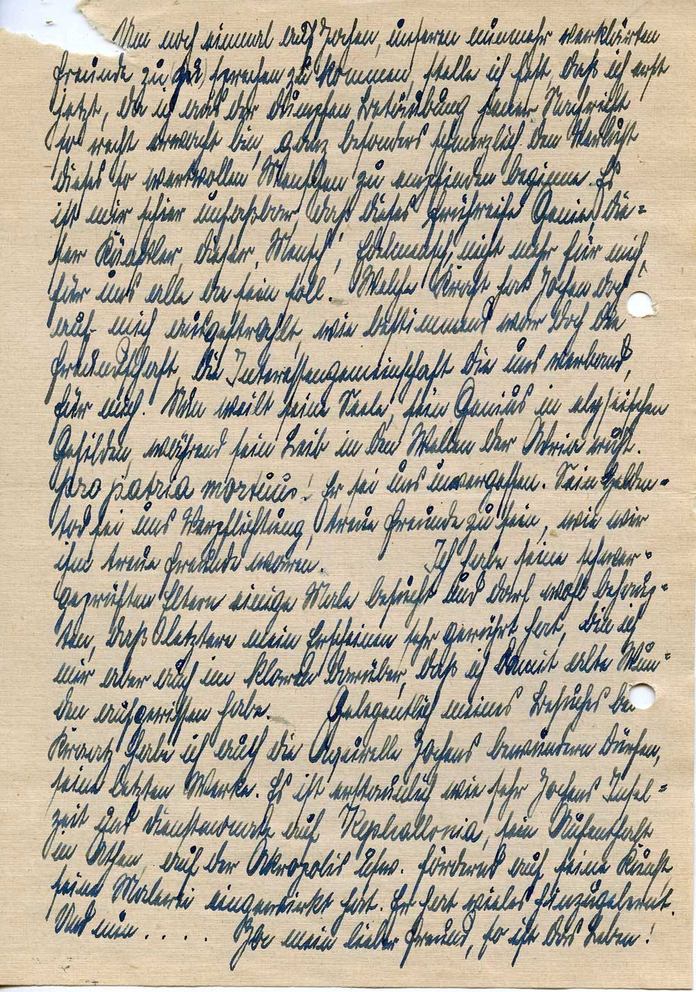 Um noch einmal auf Jochen, unseren nunmehr verklärten Freunde zu sprechen zu kommen, stelle ich fest, daß ich erst jetzt, da ich aus der dumpfen Betäubung jener Nachricht so recht erwacht bin, ganz besonders schmerzlich den Verlust dieses so wertvollen Menschen zu empfinden beginne. Es ist mir schier unfaßbar, daß dieses frühreife Genie, dieser Künstler, dieser ‚Mensch‘, Edelmensch, nicht mehr für mich, für uns alle da sein soll. Welche Kraft hat Jochen doch auf mich ausgestrahlt, wie bestimmend war doch die Freundschaft, die Interessengemeinschaft, die uns verband, für mich. Nun weilt seine Seele, sein Genius in elysischen Gefilden, während sein Leib in den Wellen der Adria ruht. Pro patria mortuus! Er sei uns unvergessen. Sein Heldentod sei uns Verpflichtung, treue Freunde zu sein, wie wir ihm treue Freunde waren. Ich habe seine schwergeprüften Eltern einige Male besucht und darf wohl behaupten, daß letztere mein Erscheinen sehr gerührt hat, bin ich mir aber auch im klaren darüber, daß ich damit alte Wunden aufgerissen habe. Gelegentlich meines Besuches bei Kraatz habe ich auch die Aquarelle Jochens bewundern dürfen, seine letzten Werke. Es ist erstaunlich wie sehr Jochens Inselzeit und Dienst[?] auf Kephallonia, sein Aufenthalt in Athen, auf der Akropolis usw. fördernd auf seine Kunst, seine Malerei eingewirkt hat. Er hat vieles hinzugelernt. Und nun .... Ja mein lieber Freund, so ist das Leben!