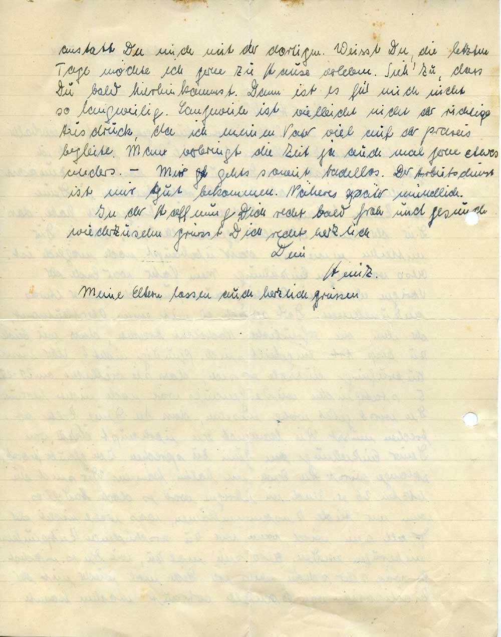 anstatt Du mich mit der dortigen. Weisst Du, die letzten Tage möchte ich gerne zu Hause verleben. Sieh‘ zu, dass Du bald hierhinkommst. Dann ist es für mich nicht so langweilig. Langeweile ist vielleicht nicht der richtige Ausdruck, da ich meinen Vater viel auf der Praxis begleite. Man verbringt die Zeit ja auch mal gerne etwas anders. – Mir gehts soweit tadellos. Der Arbeitsdienst ist mir gut bekommen. Näheres später mündlich.