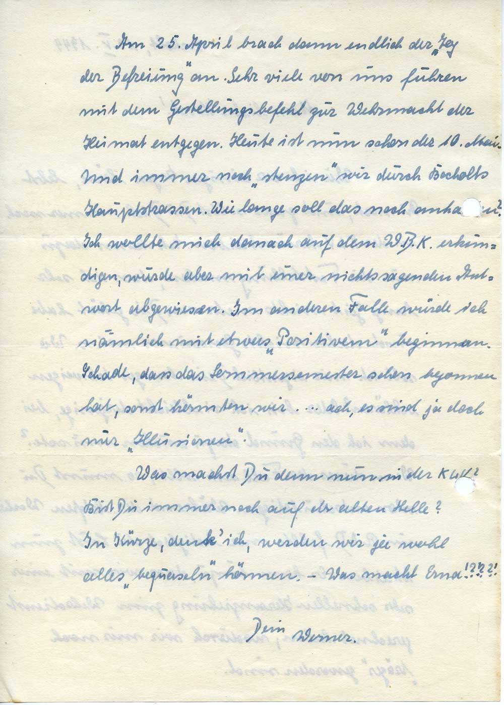 Am 25. April brach dann endlich der „Tag der Befreiung“ an. Sehr viele von uns fuhren mit dem Gestellungsbefehl zur Wehrmacht der Heimat entgegen. Heute ist nun schon der 10. Mai. Und immer noch „stenzen“ wir durch Bocholts Hauptstrassen. Wie lange soll das noch anhalten? Ich wollte mich danach auf dem W.B.K. erkundigen, wurde aber mit einer nichtssagenden Antwort abgewiesen. Im anderen Falle würde ich nämlich mit etwas „Positivem“ beginnen. Schade, dass das Sommersemester schon begonnen hat, sonst könnten wir .... ach, es sind ja doch nur „Illusionen“.