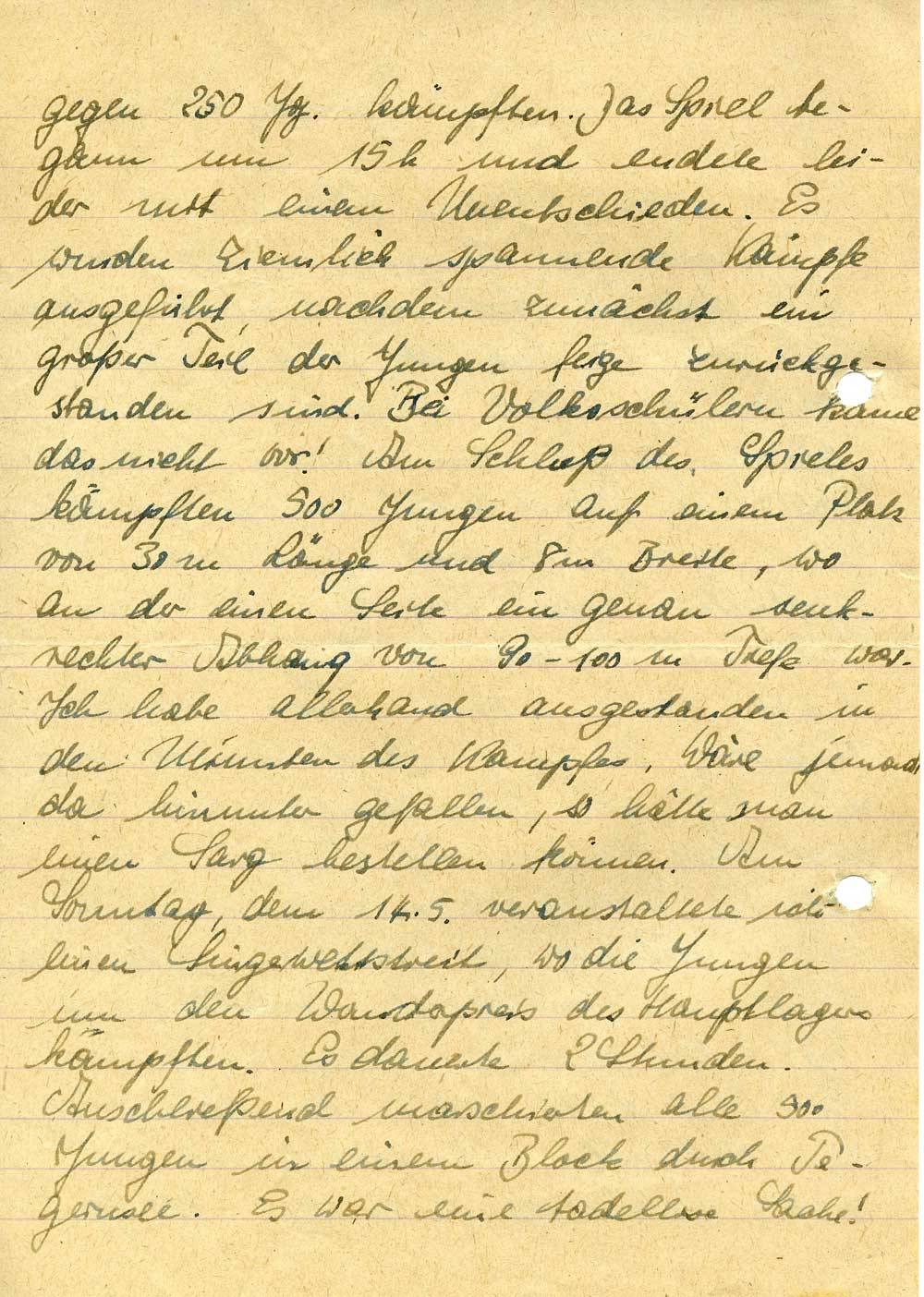 gegen 250 Jg. kämpften. Das Spiel begann um 15 h und endete leider mit einem Unentschieden. Es wurden ziemlich spannende Kämpfe ausgeführt, nachdem zunächst ein großer Teil der Jungen feige zurückgestanden sind. Bei Volksschülern käme das nicht vor! Am Schluß des Spieles kämpften 500 Jungen auf einem Platz von 30 m Länge und 8 m Breite, wo an der einen Seite ein genau senkrechter Abhang von 90-100 m Tiefe war. Ich habe allerhand ausgestanden in den Minuten des Kampfes. Wäre jemand da hinunter gefallen, so hätte man einen Sarg bestellen können. Am Sonntag, dem 14.5. veranstaltete ich einen Singerwettstreit, wo die Jungen um den Wanderpreis des Hauptlagers kämpften. Es dauerte 2 Stunden. Anschließend marschierten alle 500 Jungen in einem Block durch Tegernsee. Es war eine tadellose Sache!