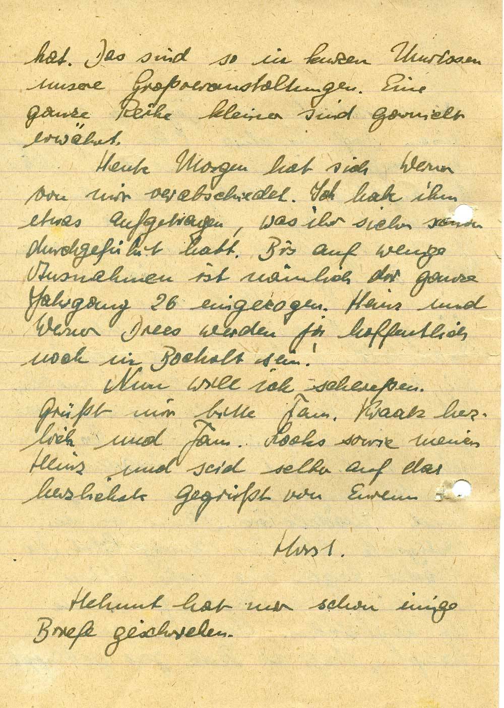Heute Morgen hat sich Werner von mir verabschiedet. Ich habe ihm etwas aufgetragen, was ihr sicher schon durchgeführt habt. Bis auf wenige Ausnahmen ist nämlich der ganze Jahrgang 26 eingezogen. Heinz und Werner Drees werden ja hoffentlich noch in Bocholt sein!